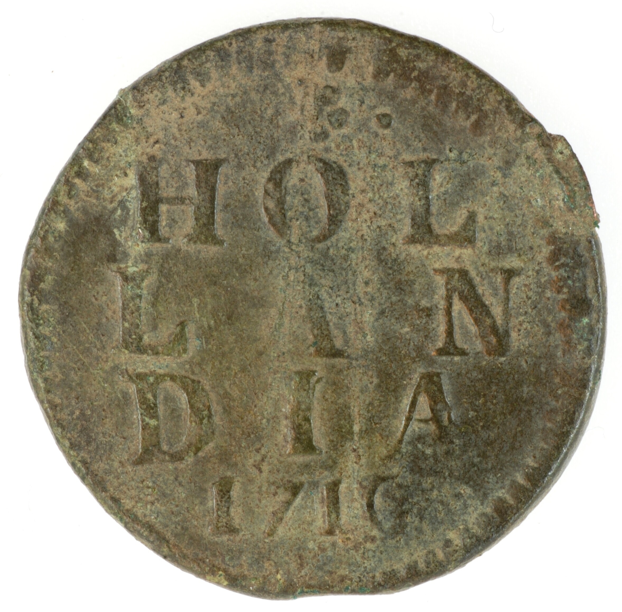 Duit; Holland Provincie (1581-1795); vz.: in vijf regels: •(rozet)• / HOL / LAN / DIA• / 1710; kz.: klimmende leeuw naar links met vrijheidshoed en een lans binnen de Hollandse tuin; muntplaats: Dordrecht; gewicht: 4.02 gram; referentie: Purmer / Wiel 2007, CNM 2.28.126 (zwaar exemplaar; zou maximaal 3,84 gram wegen)
