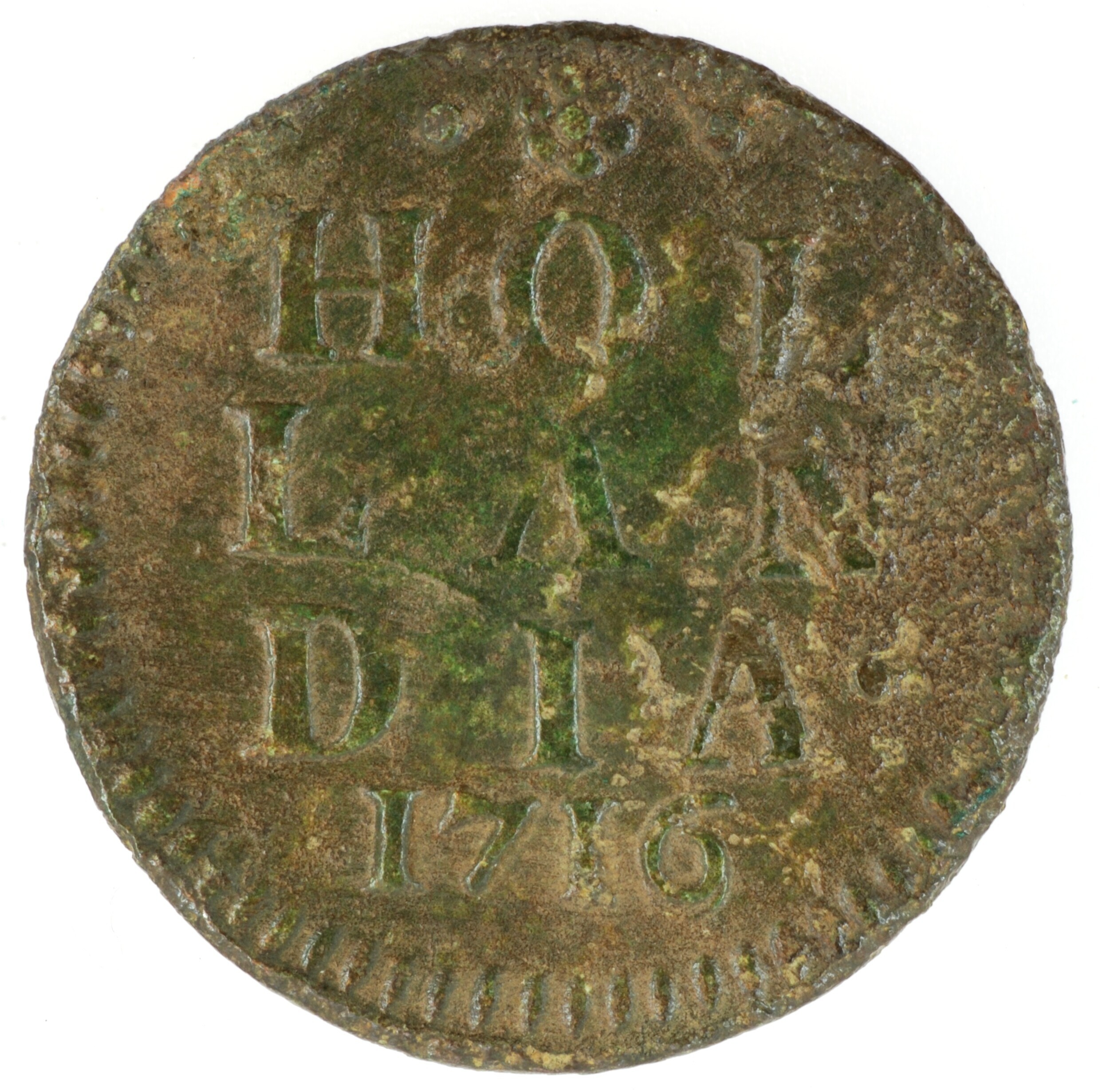 Duit; Holland Provincie (1581-1795); vz.: in vijf regels: •(rozet)• / HOL / LAN / DIA• / 1716; kz.: klimmende leeuw naar links met vrijheidshoed en een lans binnen de Hollandse tuin; muntplaats: Dordrecht; gewicht: 2,85 gram; referentie: Purmer / Wiel 2007, CNM 2.28.126