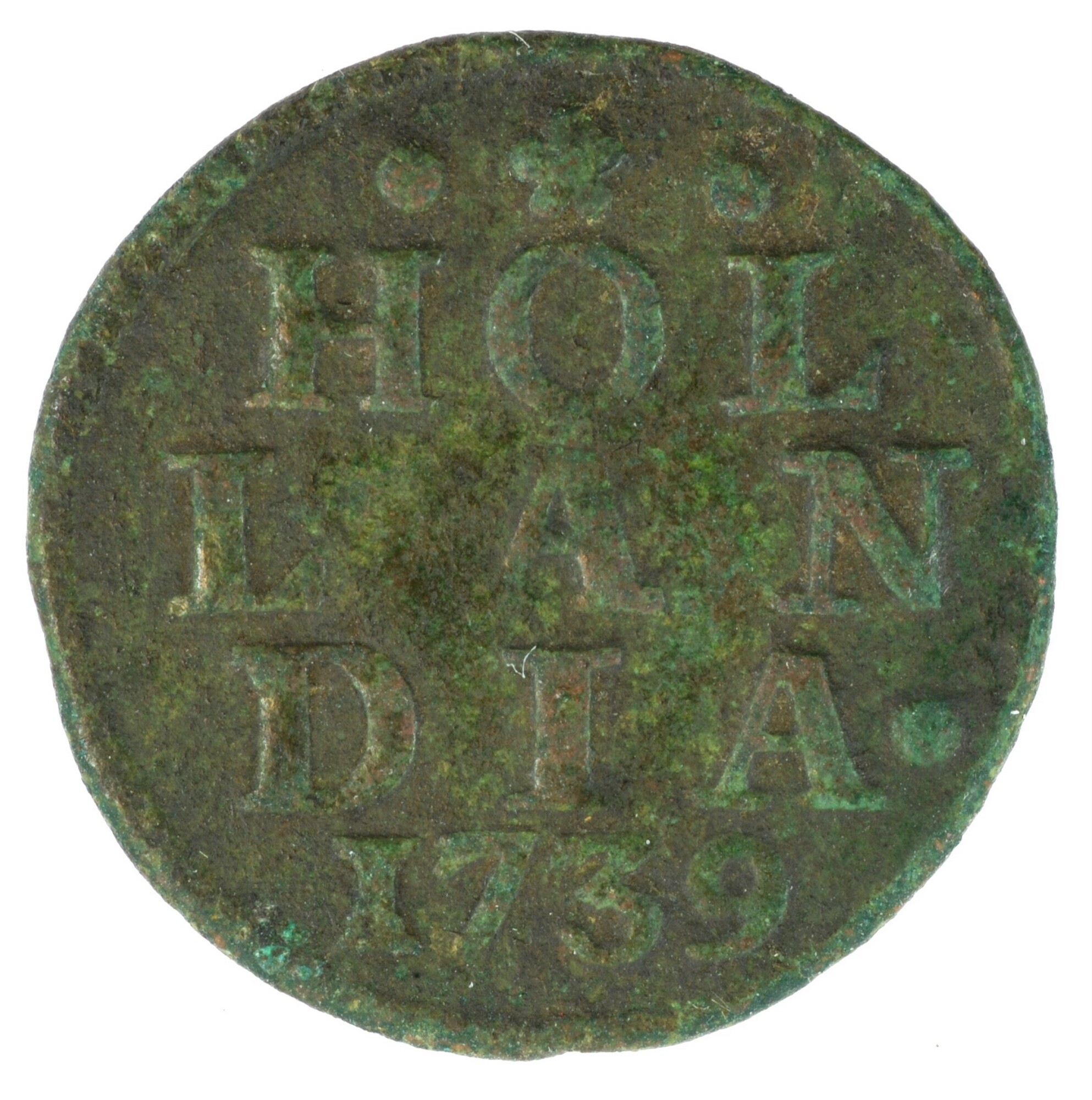 Duit; Holland Provincie (1581-1795); vz.: in vijf regels: •(rozet)• / HOL / LAN / DIA• / 1739; kz.: klimmende leeuw naar links met vrijheidshoed en een lans binnen de Hollandse tuin; muntplaats: Dordrecht; gewicht: 2,92 gram; referentie: Purmer / Wiel 2007, CNM 2.28.126