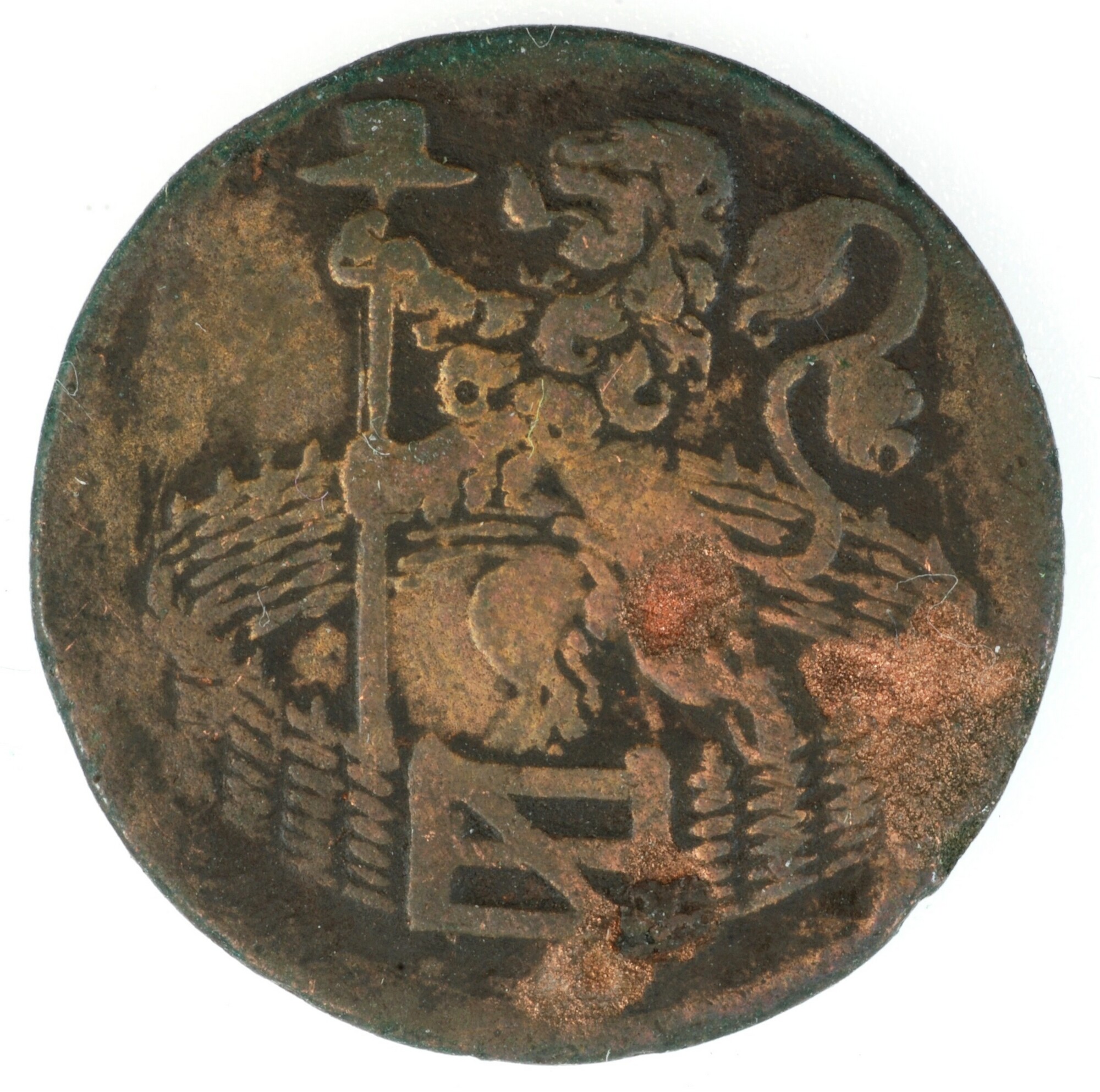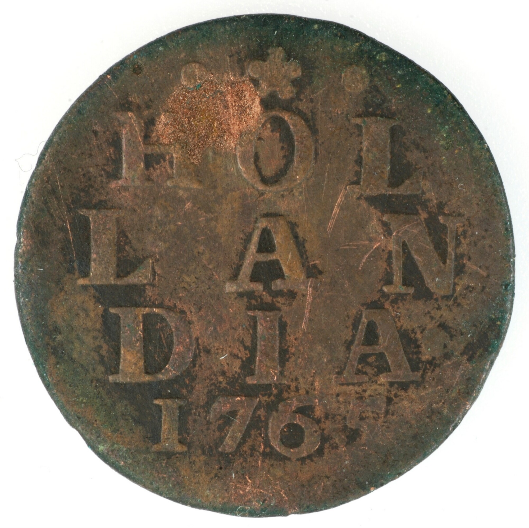 Duit; Holland Provincie (1581-1795); vz.: in vijf regels: •(rozet)• / HOL / LAN / DIA• / 1765; kz.: klimmende leeuw naar links met vrijheidshoed en een lans binnen de Hollandse tuin; muntplaats: Dordrecht; gewicht: 2,76 gram; referentie: Purmer / Wiel 2007, CNM 2.28.126