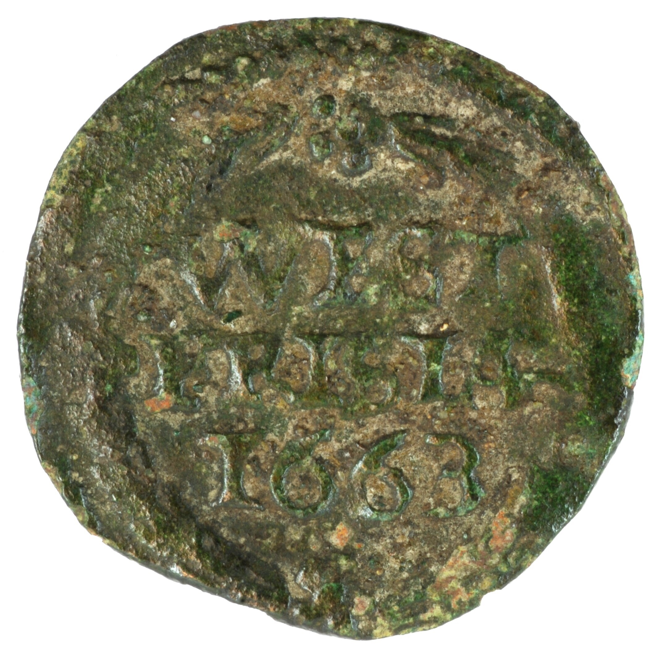 Duit; West-Friesland Provincie (1581-1795); vz.: binnen een bladerkrans in drie regels WEST / FRISIAE / 1663; kz.: gekroond en versierd wapenschild van West-Friesland, terzijde twee punten, met omschrift DEVS FO[RTI•ET•]SP•NOS; muntplaats: Medemblik; gewicht: 1.64 gram; referentie: Purmer / Wiel 3003, CNM 2.46.91