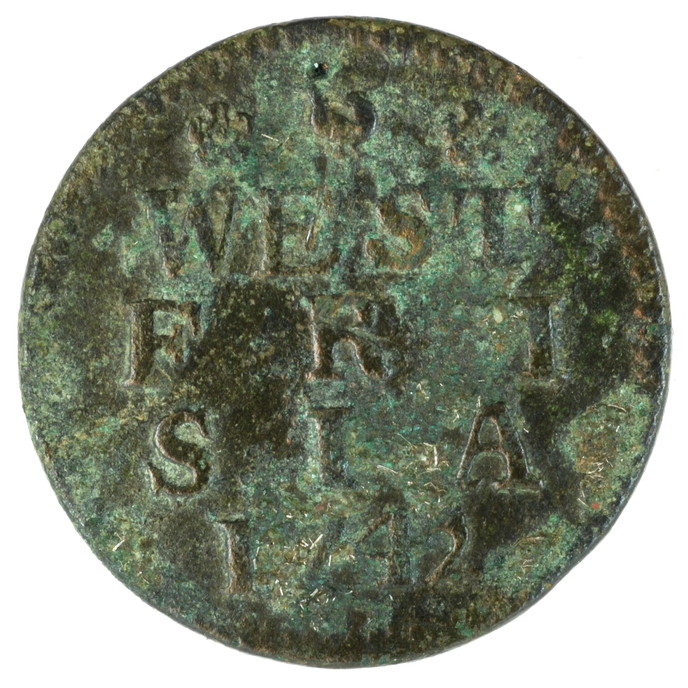 Duit; West-Friesland Provincie (1581-1795); vz.: in vijf regels: rozet (haan) rozet / WEST / FRI / SIAE / 1742; kz.: gekroond wapenschild van West-Friesland met lauwertakken; muntplaats: Medemblik; gewicht: 3.17 gram; referentie: Purmer / Wiel 3011, CNM 2.46.98