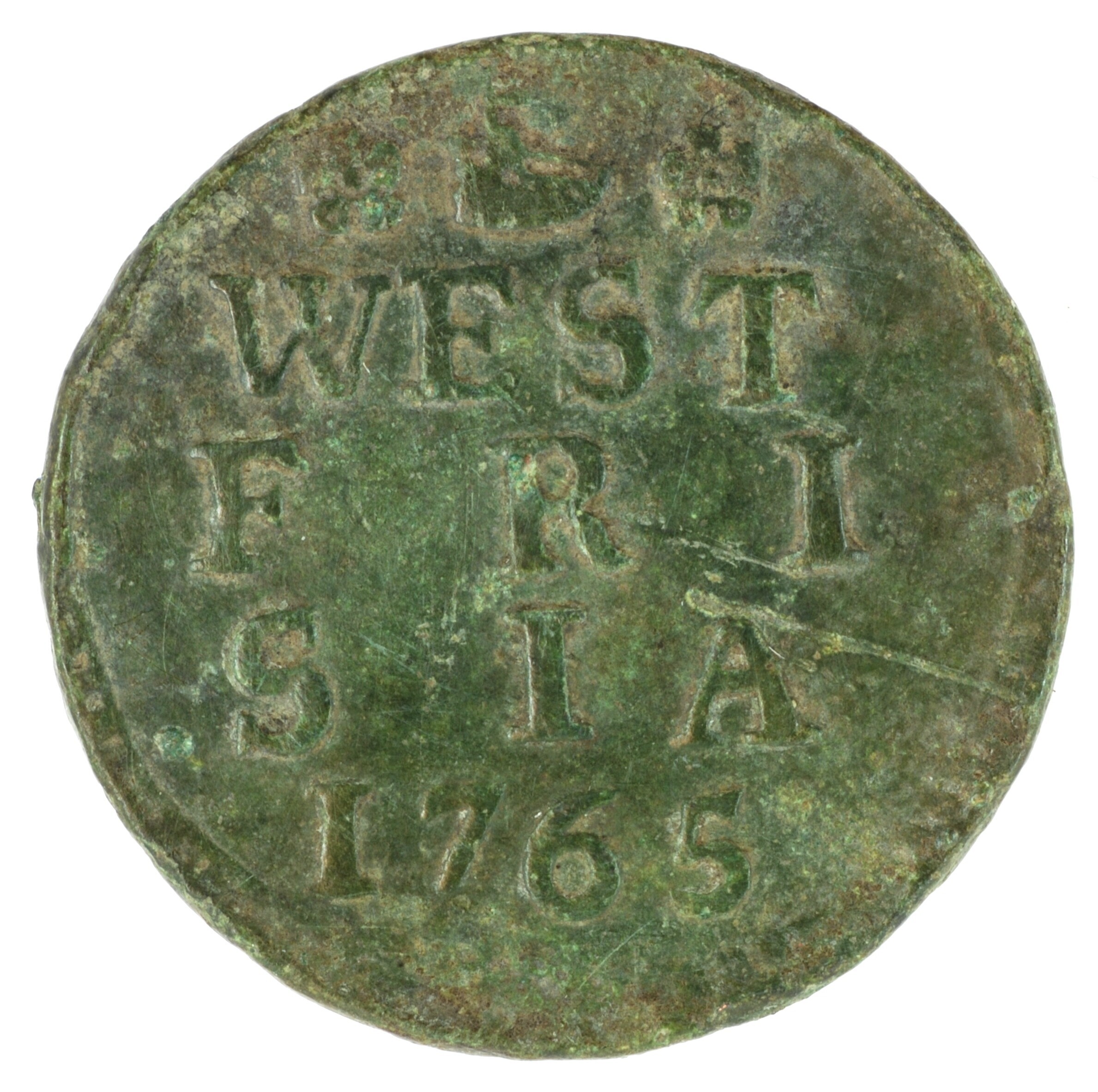 Duit; West-Friesland Provincie (1581-1795); vz.: in vijf regels: rozet (haringbuis) rozet / WEST / FRI / SIAE / 1765; kz.: gekroond wapenschild van West-Friesland met lauwertakken; muntplaats: Enkhuizen; gewicht: 3.23 gram; referentie: Purmer / Wiel 3013, CNM 2.46.98