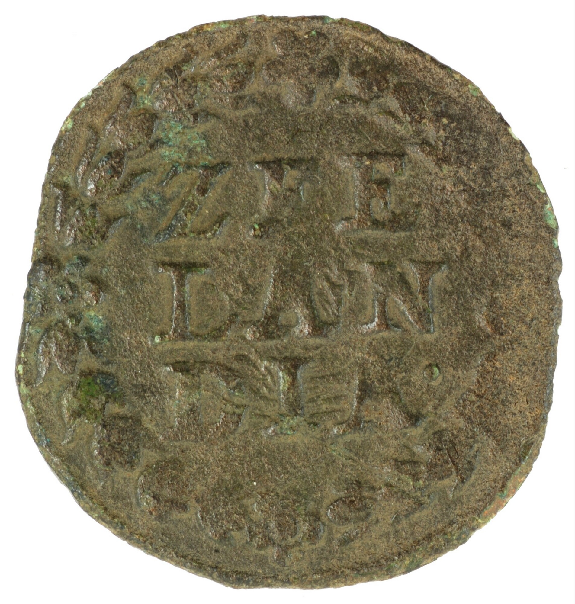 Duit; Zeeland Provincie (1581-1795); vz.: de maagd, zittend achter het wapenschild van Zeeland in een tuin met gesloten omheining, met omschrift LUCTOR•ET• - EMERGO•1663 (burcht) •; kz.: binnen een bladerkrans in drie regels: ZEE / LAN / DIA•; muntplaats: Middelburg; schaars; gewicht: 2,05 gram; referentie: Purmer / Wiel 4005 var (punt na DIA), CNM 2.49.106