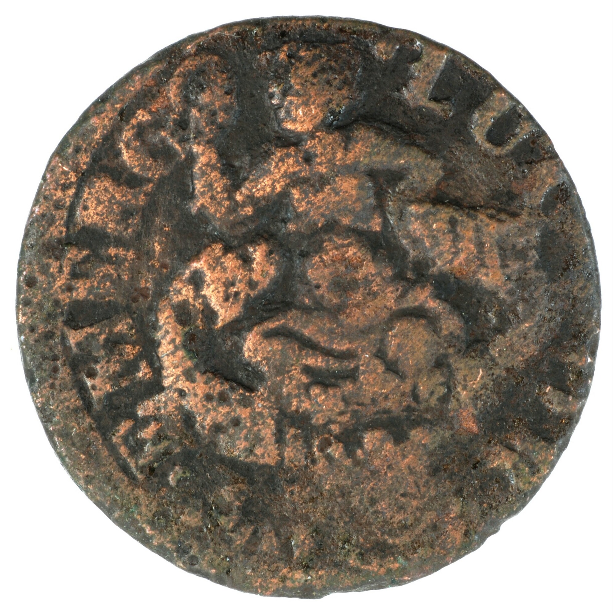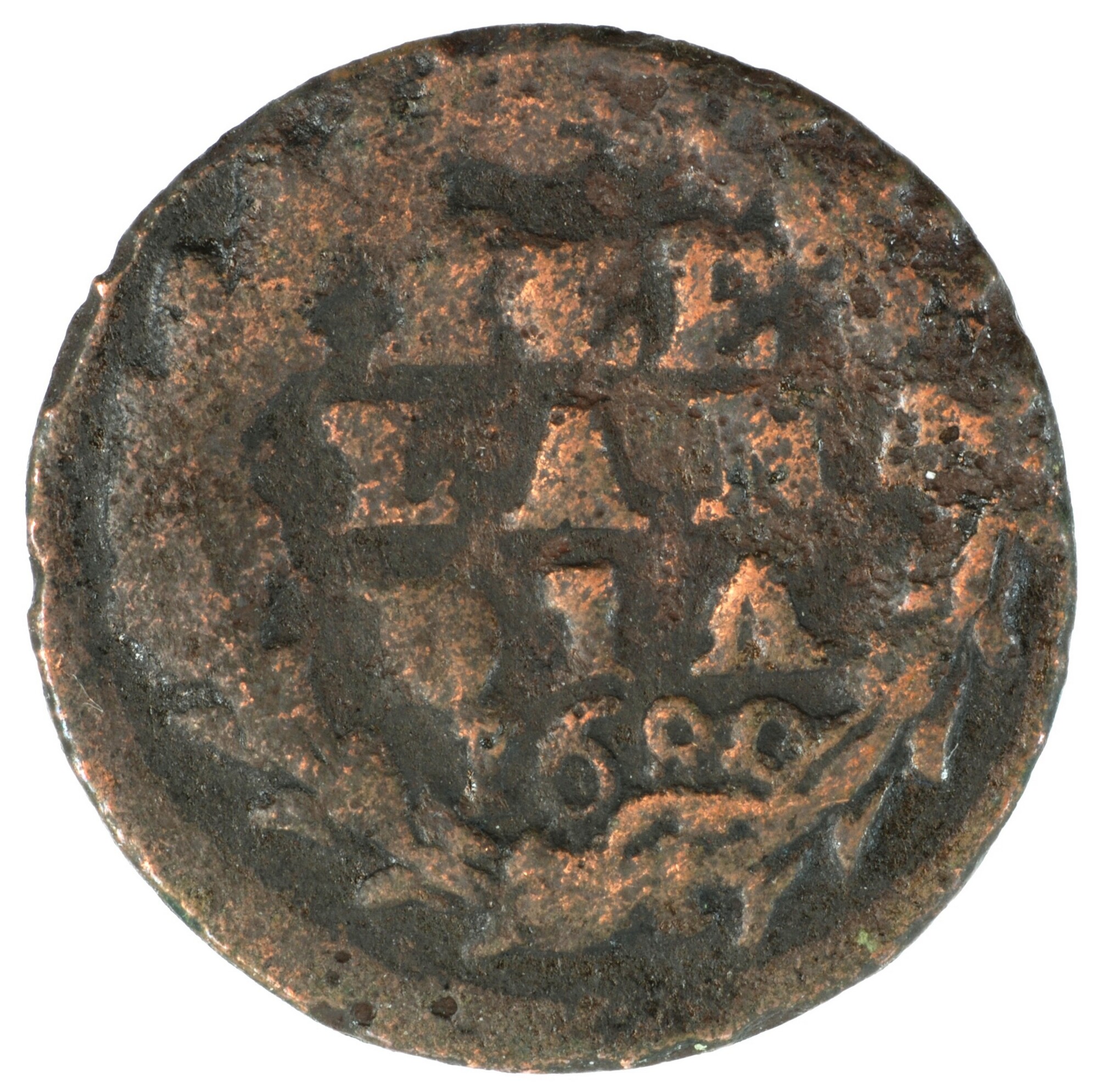 Duit; Zeeland Provincie (1581-1795); vz.: de maagd, zittend achter het wapenschild van Zeeland in een tuin met gesloten omheining, met omschrift •LUCTOR• - ET•EMERGO•; kz.: binnen een bladerkrans in vier regels: ZEE / LAN / DIA / 1680; muntplaats: Middelburg; zeer zeldzaam; gewicht: 2,17 gram; referentie: Purmer / Wiel 4007 var (geen muntteken), CNM 2.49.108. ...