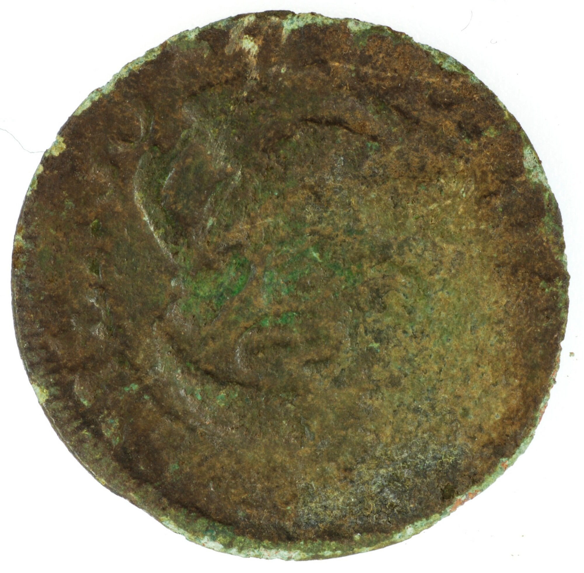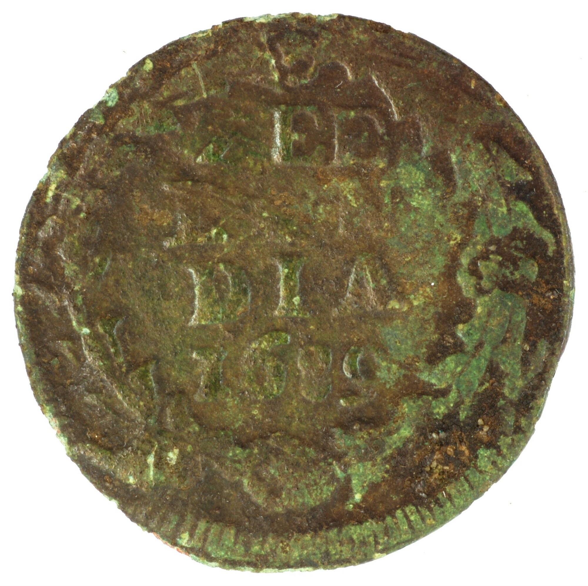 Duit; Zeeland Provincie (1581-1795); vz.: de maagd, zittend achter het wapenschild van Zeeland in een tuin met gesloten omheining, met omschrift LUCTOR• - [E]T•EMERGO (burcht); kz.: binnen een bladerkrans in vier regels: ZEE / LAN / DIA / 1689; muntplaats: Middelburg; gewicht: 1,48 gram; referentie: Purmer / Wiel 4007 var (geen punten voor en achter ...