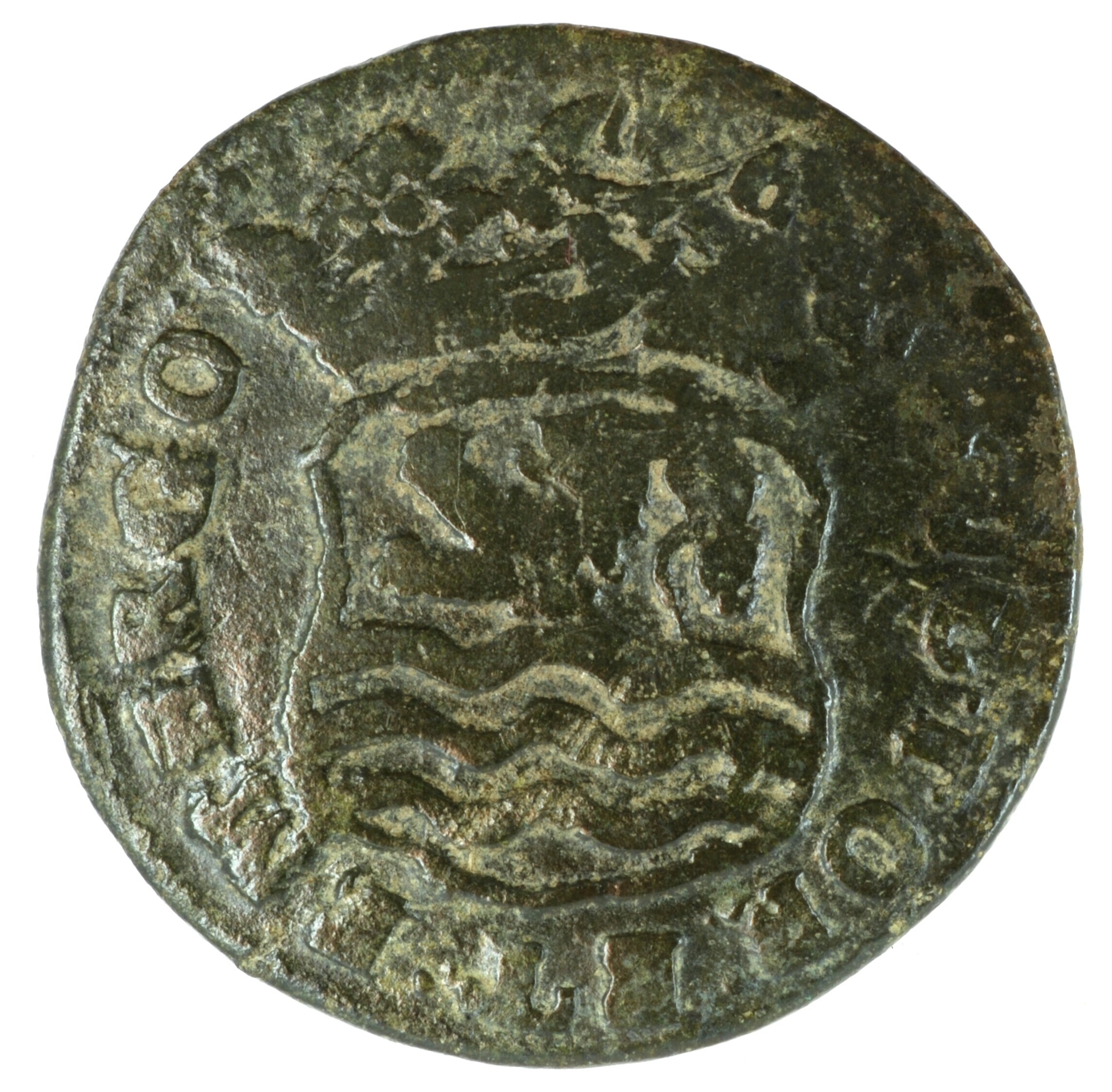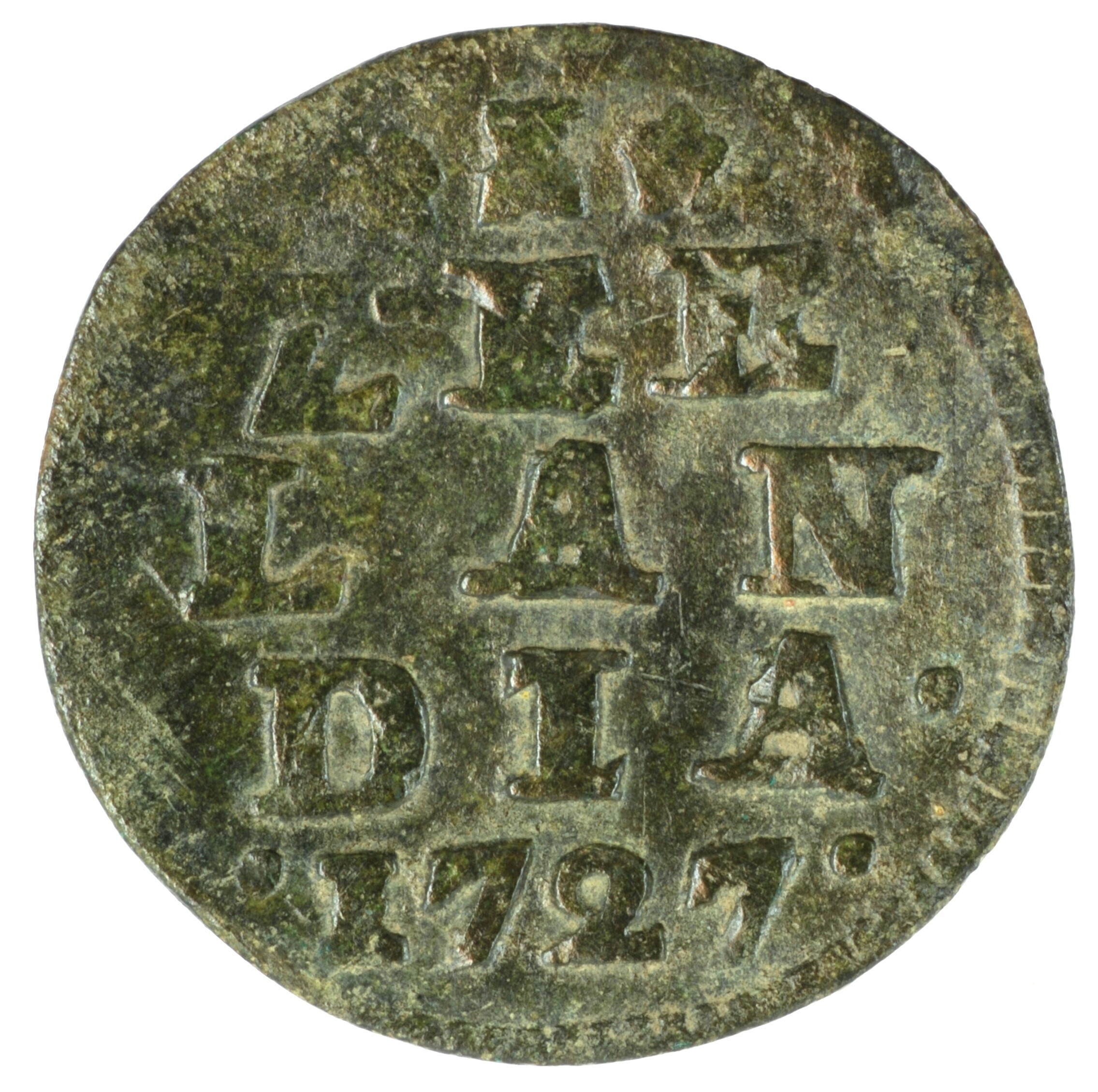 Duit; Zeeland Provincie (1581-1795); vz.: gekroond, zijdelings ingedeukt wapenschild van Zeeland, de staart van de leeuw is naar voren gekruld, met omschrift LUC•TOR•ET•EMERGO•; kz.: in vijf regels: ster (burcht) ster / ZEE / LAN / DIA• / •1727•; muntplaats: Middelburg; gewicht: 2,53 gram; referentie: Purmer / Wiel 4010 var (punt in midden LUCTOR), CNM 2.49.111