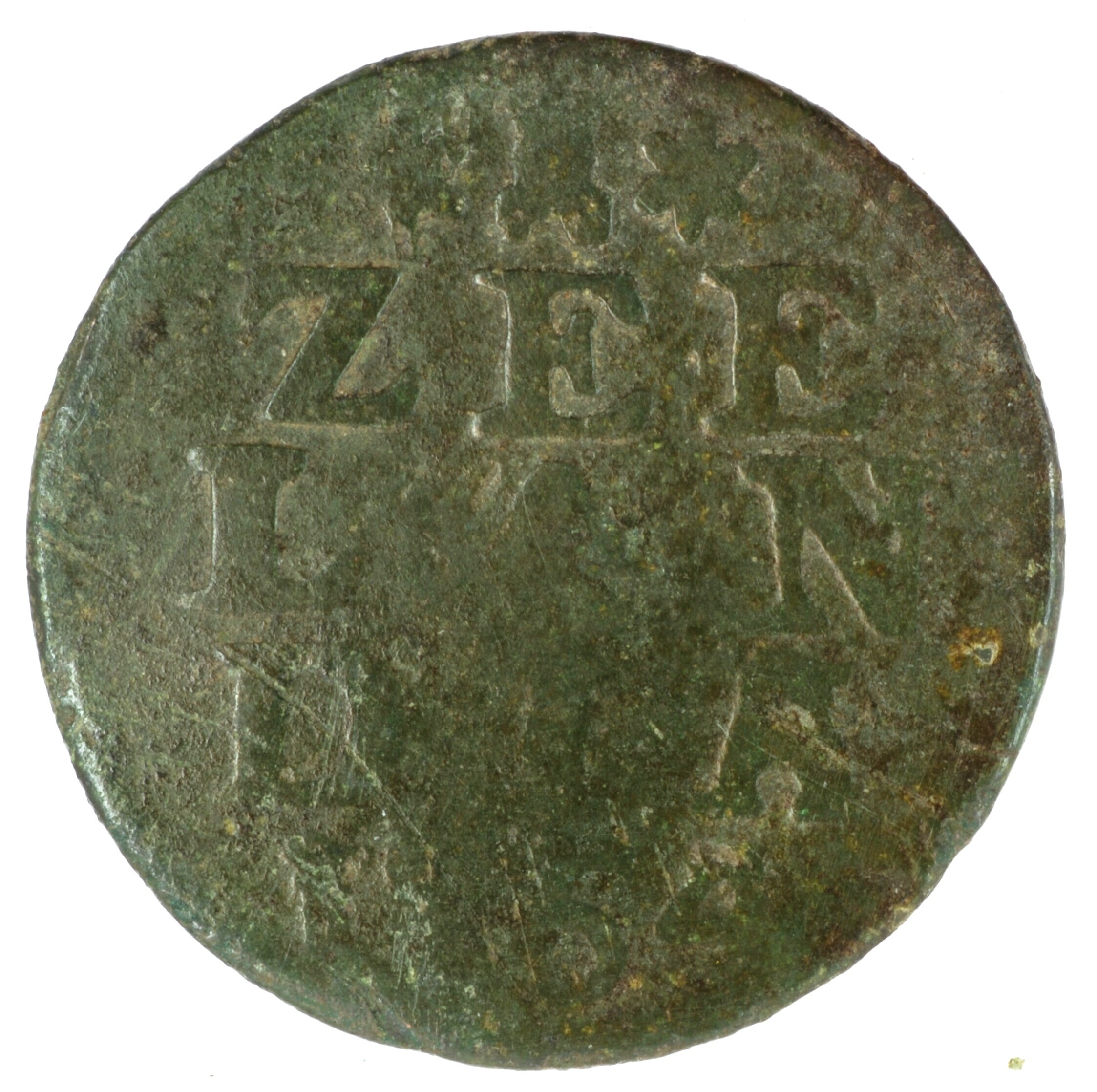 Duit; Zeeland Provincie (1581-1795); vz.: gekroond, zijdelings ingedeukt wapenschild van Zeeland, de staart van de leeuw is naar achteren gekruld, met omschrift L[UC]TOR ET EMERGO; kz.: in vijf regels: ster (burcht) ster / ZEE / LAN / DIA / 1754; muntplaats: Middelburg; gewicht:: 2,53 gram; referentie: Purmer / Wiel 4011, CNM 2.49.112