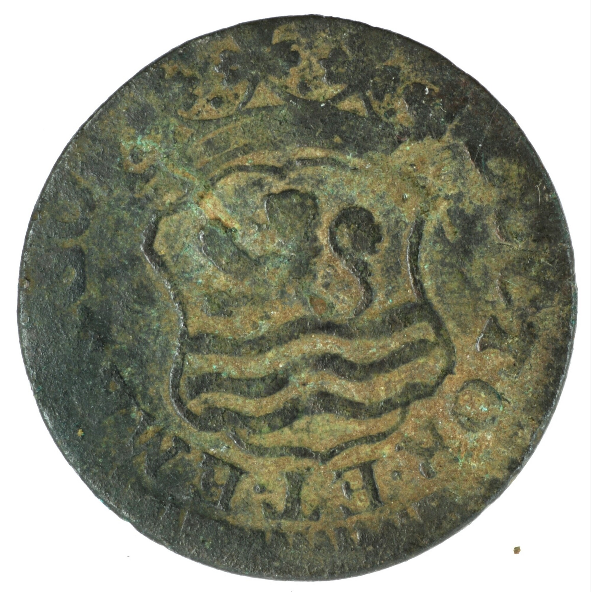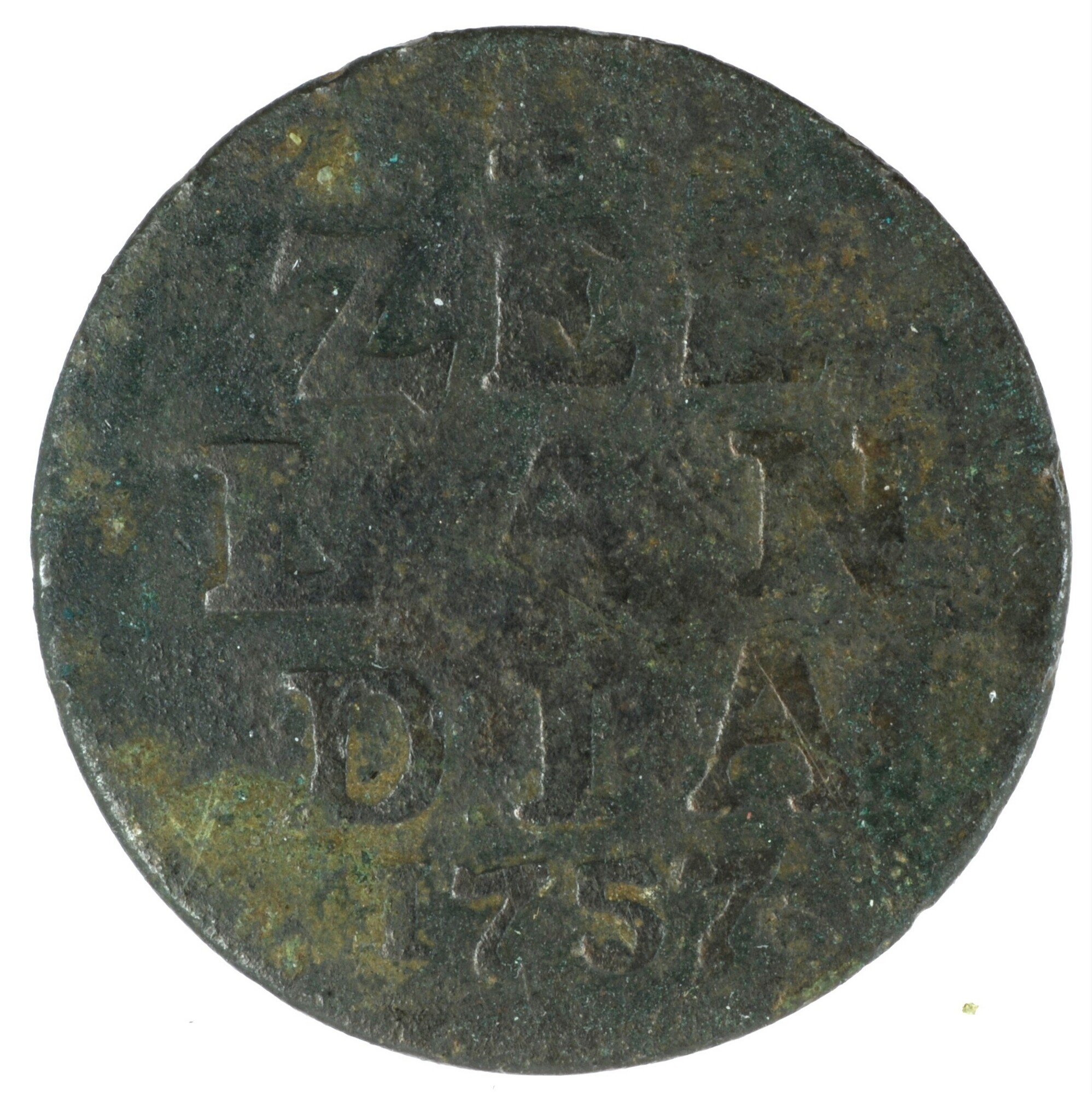 Duit; Zeeland Provincie (1581-1795); vz.: gekroond, zijdelings ingedeukt wapenschild van Zeeland, de staart van de leeuw is naar achteren gekruld, met omschrift LUCTOR•ET•EMERGO; kz.: in vijf regels: ster (burcht) ster / ZEE / LAN / DIA• / 1757; muntplaats: Middelburg; gewicht: 2,42 gram; referentie: Purmer / Wiel 4011 var (punten op voorzijdetekst en punt achter ...