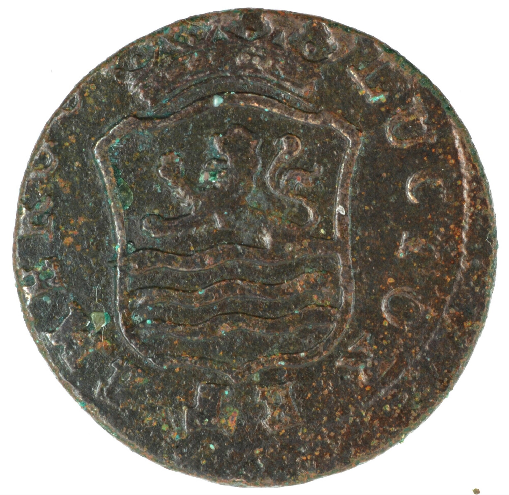 Duit; Zeeland Provincie (1581-1795); vz.: gekroond, zijdeling ingedeukt wapenschild van Zeeland, de staart van de leeuw is naar voren gekruld, met omschrift LUCTOR ET EMERG[O]; kz.: binnen een bladerkrans in vijf regels: ster (burcht) ster / ZEE / LAN / DIA / 1793; gewicht: 2,83 gram; muntplaats: Middelburg; referentie: Purmer / Wiel 4013, CNM 2.49.114