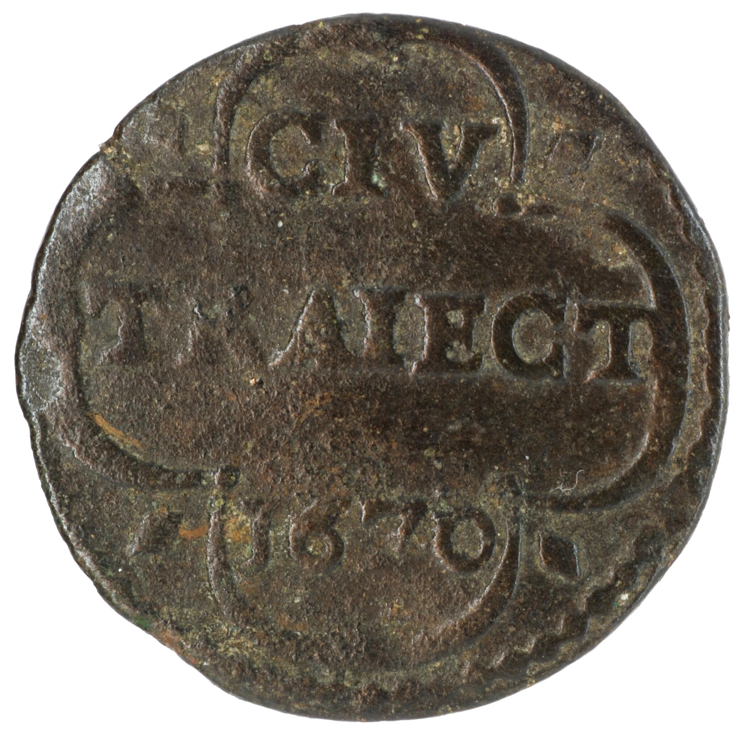 Duit; Utrecht Stad (1581-1795); vz.: binnen een aan de buitenkant met vier ruiten versierde vierpas CIV / TRAIECT / 1670; kz.: gekroond en horizontaal gearceerd stedelijk wapenschild, gehouden door twee leeuwen, met omschrift UTRECHT; muntplaats: Utrecht; gewicht: 2.11 gram; referentie: Purmer / Wiel 5108, CNM 2.44.18