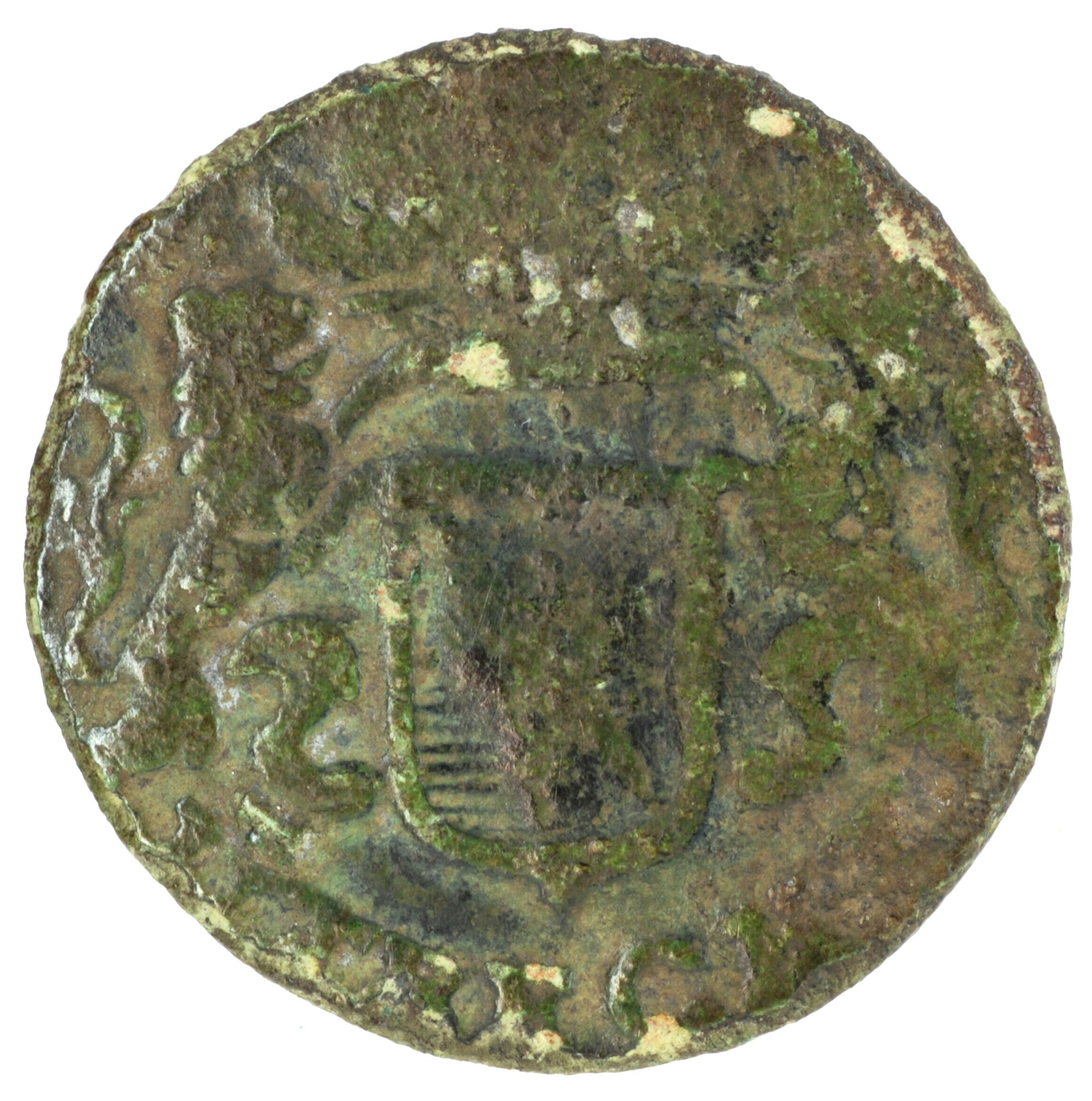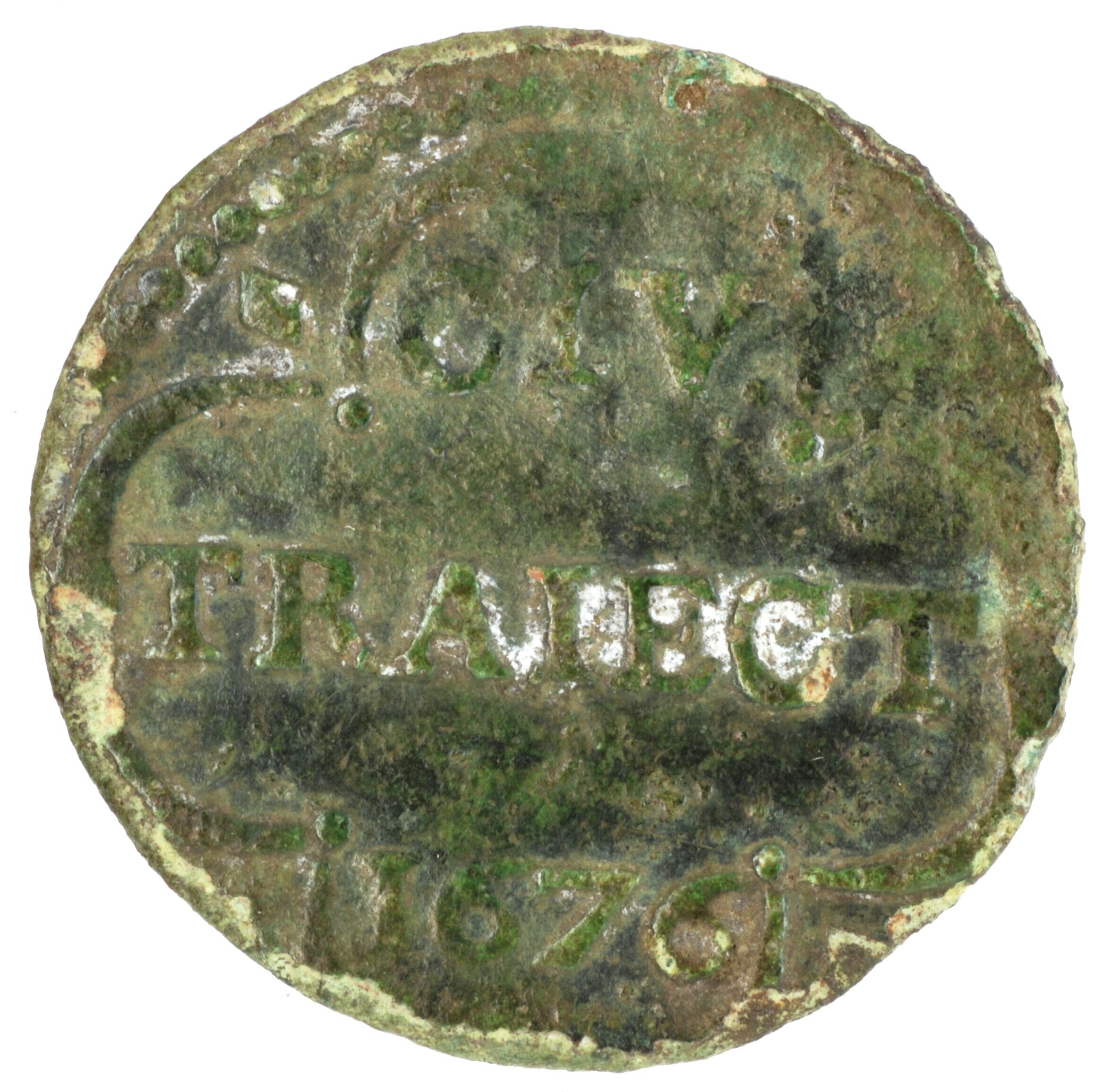 Duit; Utrecht Stad (1581-1795); vz.: binnen een aan de buitenkant met vier ruiten versierde vierpas CIV. / TRAIECT / 1676; kz.: gekroond en horizontaal gearceerd stedelijk wapenschild, gehouden door twee leeuwen, met omschrift UTRECHT; muntplaats: Utrecht; gewicht: 1.91 gram; referentie: Purmer / Wiel 5108, CNM 2.44.18