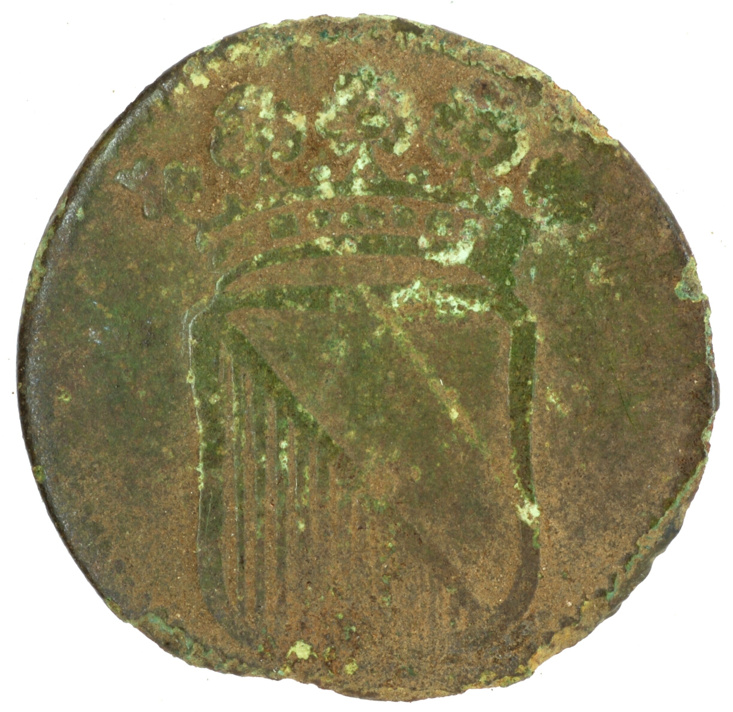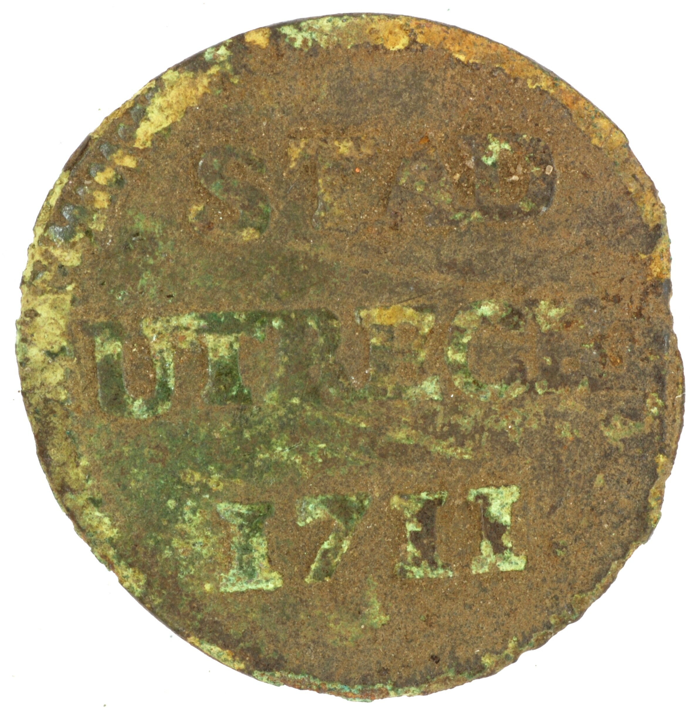 Duit; Utrecht Stad (1581-1795); vz.: in drie regels: STAD / UTRECH[T] / 1711.; kz.: gedamasceerd stedelijk wapenschild; muntplaats: Utrecht; gewicht: 2.90 gram; referentie: Purmer / Wiel 5110 var (punt na jaartal), CNM 2.44.20