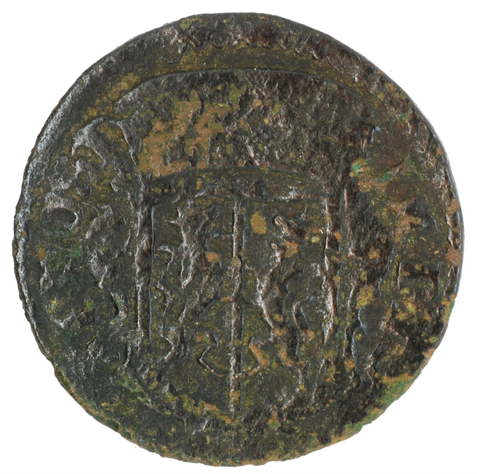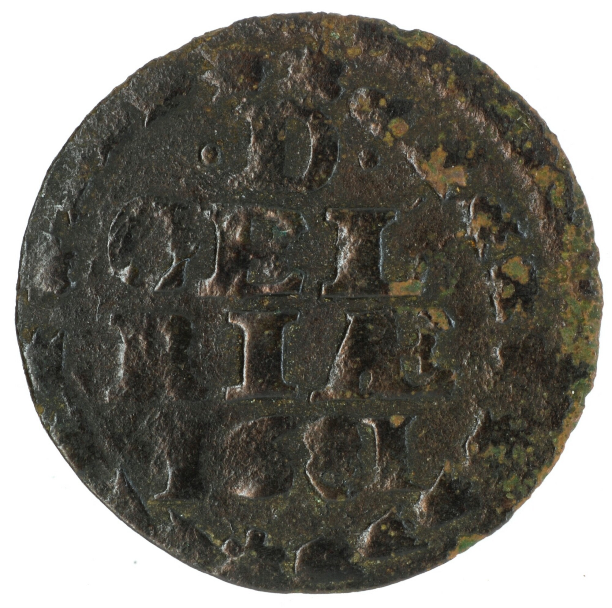 Duit; Gelderland Provincie (1581-1795); vz.: binnen een bladerkrans in vier regels: •D• / GEL / RIAE / 1681; kz.: gekroond wapenschild van Gelderland met lintvormige versiering, met omschrift IN D[EO] – SP NOST; muntplaats: Harderwijk; gewicht: 1.70 gram; referentie: Purmer / Wiel 1010 var (geen punten), CNM 2.17.187