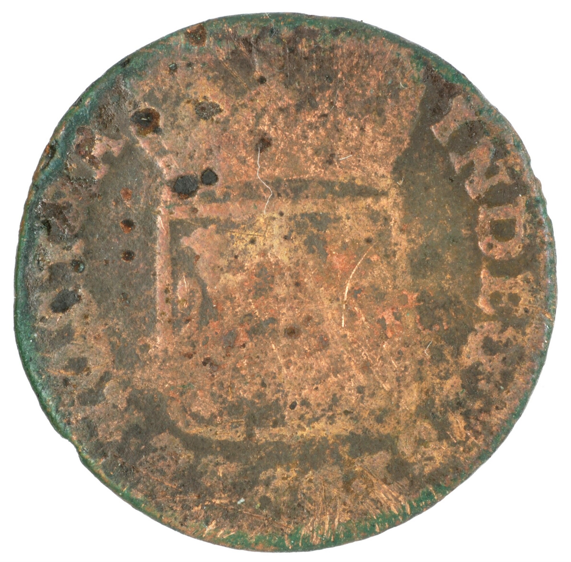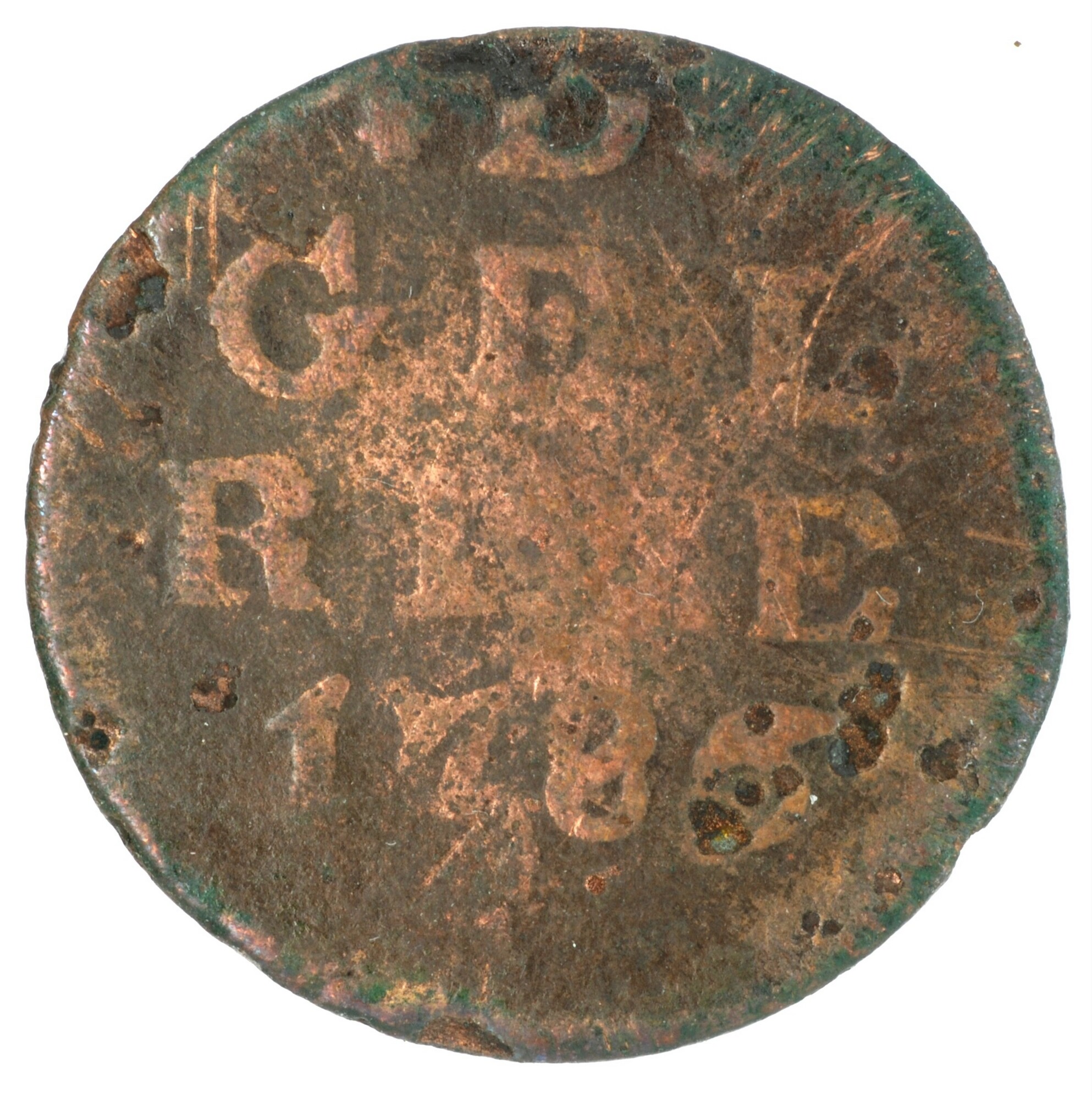 Duit; Gelderland Provincie (1581-1795); vz.: in vijf regels: (rozet) D (rozet) / GEL / RIAE / 1786 / (korenaar); kz.: gekroond wapenschild van Gelderland, met omschrift IN•DEO•EST•SPES•NOSTRA; muntplaats: Harderwijk; gewicht: 2.86 gram; referentie: Purmer / Wiel 1018 var (zonder interpunctie om jaartal), CNM 2.17.196