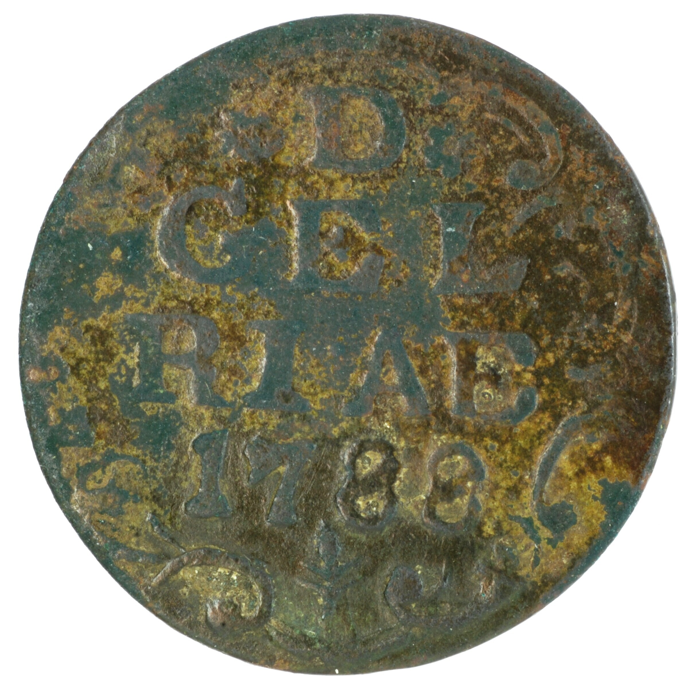 Duit; Gelderland-Provincie (1581-1795); vz.: binnen weelderige krulversiering in vijf regels: rozet D rozet / GEL / RIAE / 1788 / (korenaar); kz.: gekroond wapenschild van Gelderland, met omschrift IN DEO•EST•SPES•NOSTRA; muntplaats: Harderwijk; gewicht: 2.92 gram; referentie: Purmer / Wiel 1019, CNM 2.17.197