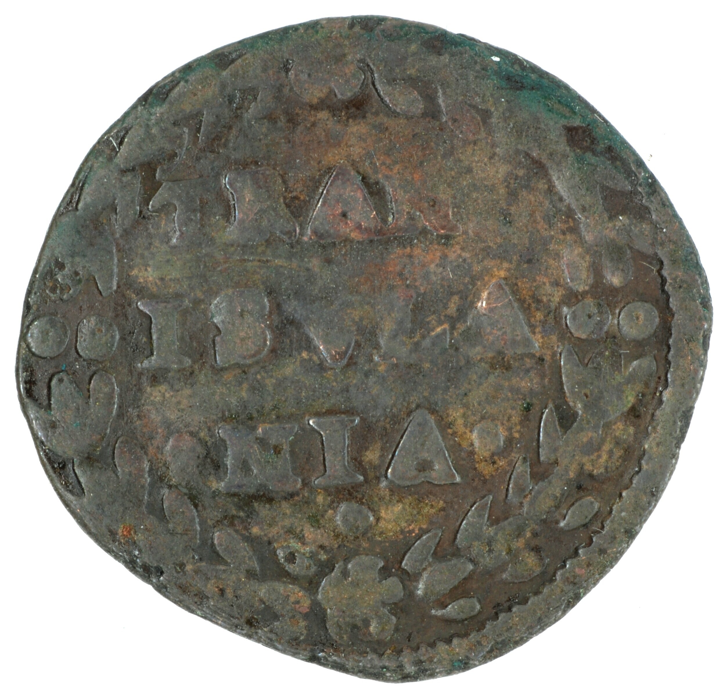 Duit; Overijssel provincie (1581-1795); vz.: binnen een bladerkrans in vier regels: TRAN[S] / ISVLA / •NIA• / • ; muntplaats: Kampen; kz.: gekroond en versierd wapenschild van Overijssel; gewicht: 2.20 gram; referentie: Purmer / Wiel 7004 var (geen omega maar een N in TRANS en geen punt boven TRANS), CNM 2.38.110