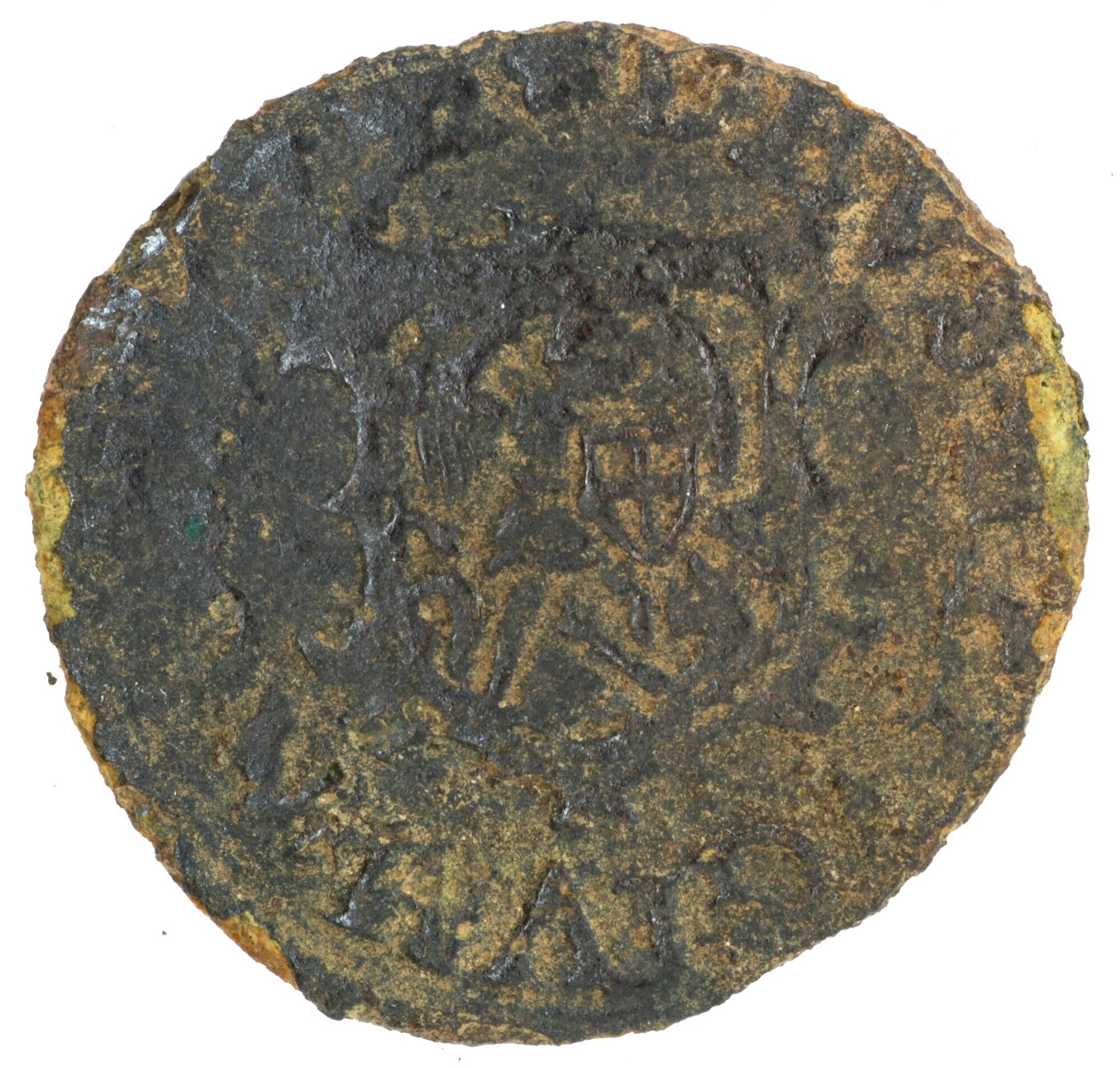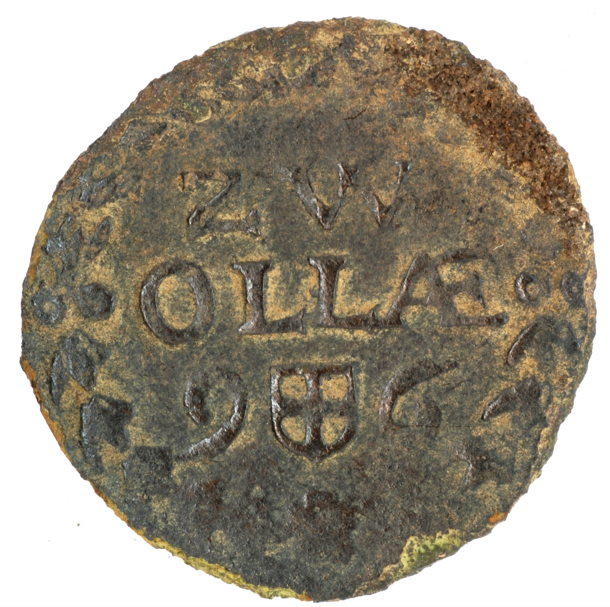 Duit; Overijssel Provincie (1581-1795); Steden: Zwolle; vz.: binnen een bladerkrans in drie regels: ZW / OLLAE / 15 (stadswapen) 96; kz.: wapenschild van Zwolle (st. Michiel met als schild het Zwolse kruis, met omschrift DEVS•REFVGIVM•NOSTRVM (bloem); muntplaats Zwolle; gewicht: 2.31 gram; zeldzaam; referentie: Purmer / Wiel 7301, CNM 2.52.116