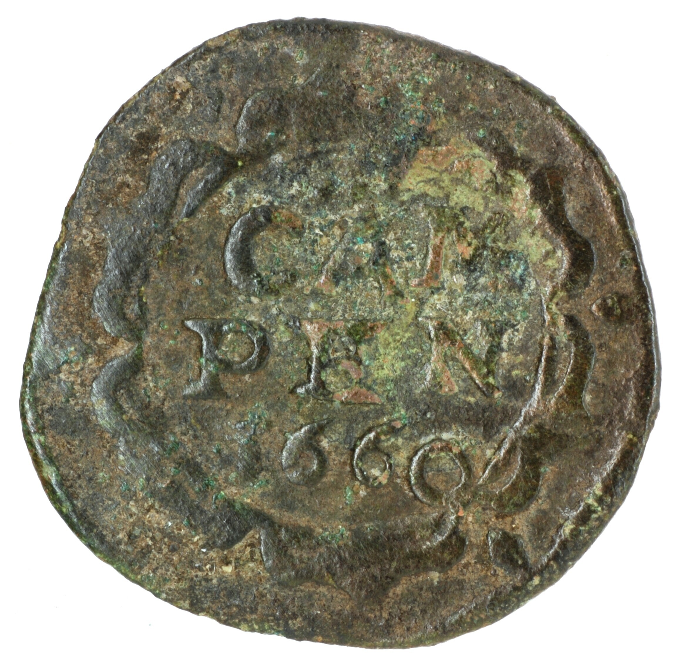 Duit; Overijssel Provincie (1581-1795); Steden: Kampen; vz.: binnen een versierde rand in vier regels: • * [•] / CAM / PEN / 1660; kz.: stadswapen in een gesloten lauwerkrans; muntplaats: Kampen; gewicht: 1.98 gram; schaars; referentie: Purmer / Wiel 7205, CNM 2.30.83
