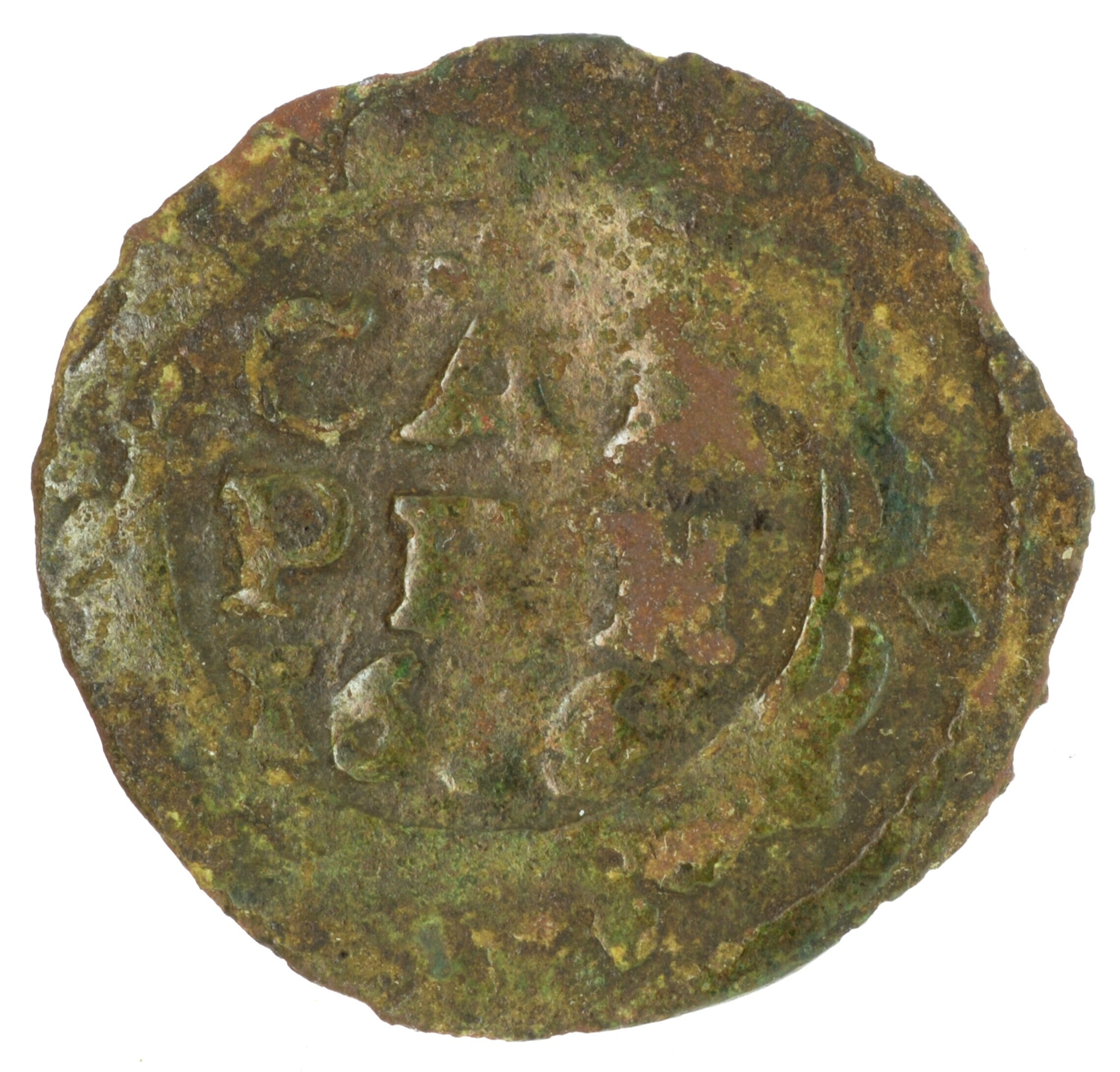 Duit; Overijssel Provincie (1581-1795); Steden: Kampen; vz.: binnen een versierde rand in vier regels: • [* •] / CA[M] / PEN / 16[6]0; kz.: stadswapen in een gesloten lauwerkrans; muntplaats: Kampen; gewicht: 1.22 gram; schaars; referentie: Purmer / Wiel 7205, CNM 2.30.83