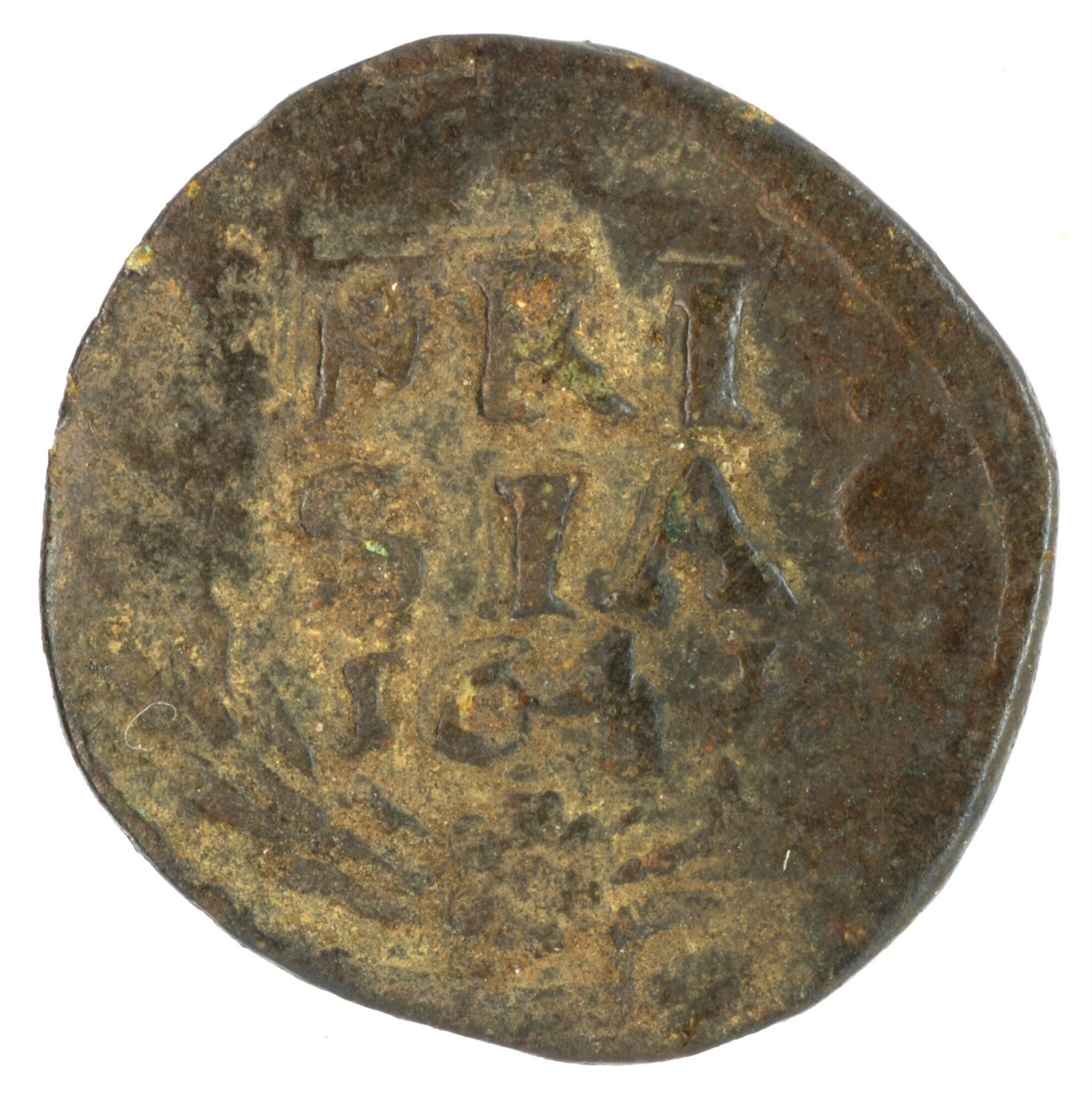 Duit; Friesland Provincie (1581-1795); vz.: binnen een bladerkrans in drie regels FRI / SIA / 1643; kz.: met open kroon gekroond en versierd wapenschild van Friesland, met omschrift NISI•DNS• – [•NO]BISCV[M]; muntplaats: Leeuwarden; gewicht: 1.45 gram; referentie: Purmer / Wiel 6006, CNM 2.16.142