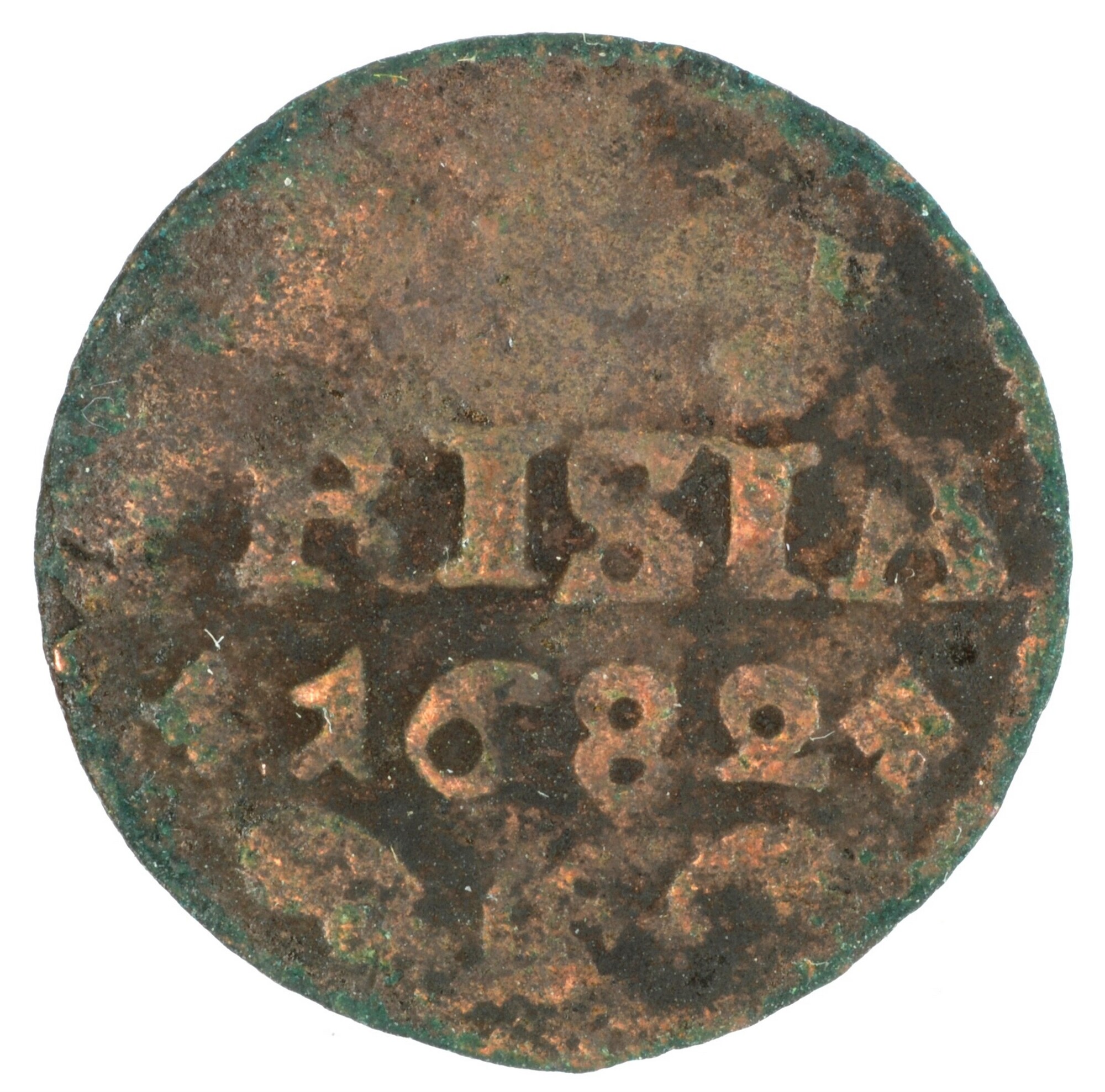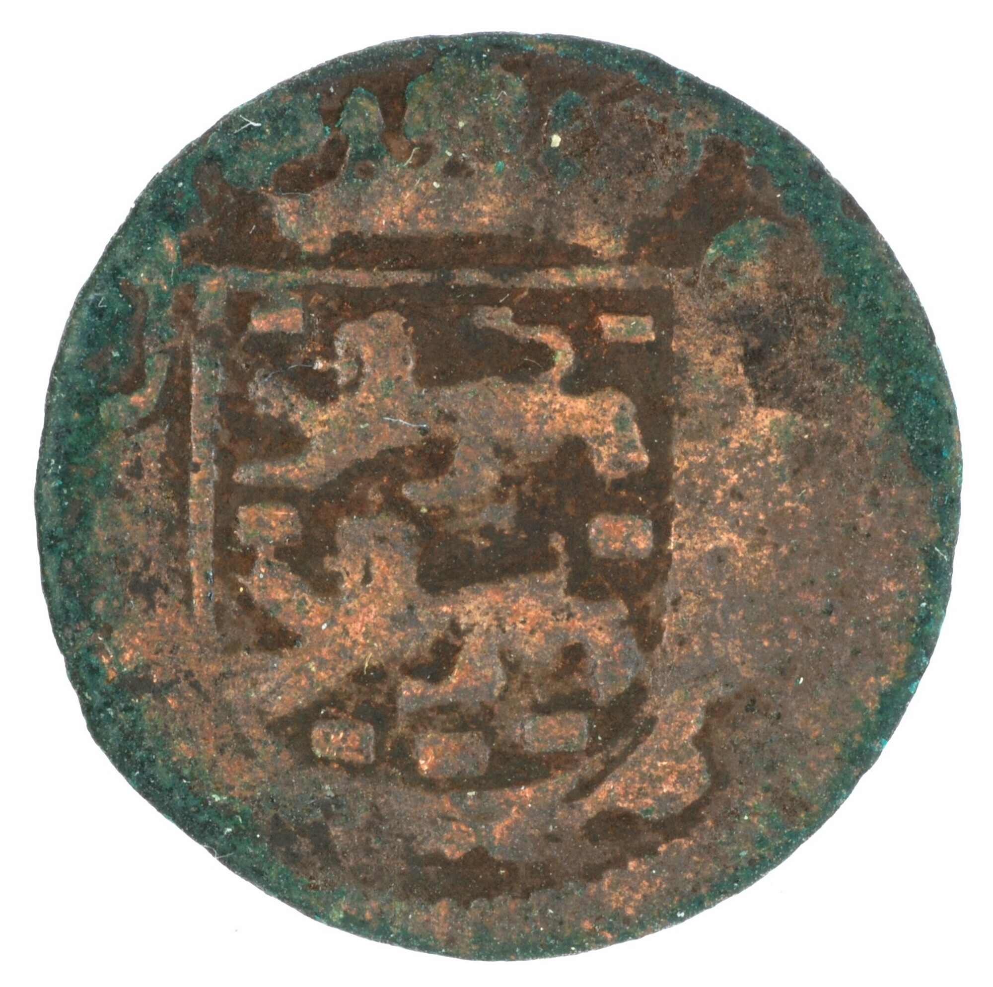 Duit; Friesland Provincie (1581-1795); vz.: in vier regels: muntteken klimmende leeuw tussen twee bladornamenten / FRISIA / (rozet) 1682 (rozet) / bladornament (rozet) bladornament; kz.: met open kroon gekroond en versierd wapenschild van Friesland; muntplaats: Leeuwarden; 1.56 gram; referentie: Purmer / Wiel 6008 var (jaartal tussen rozetten), CNM 2.16.144