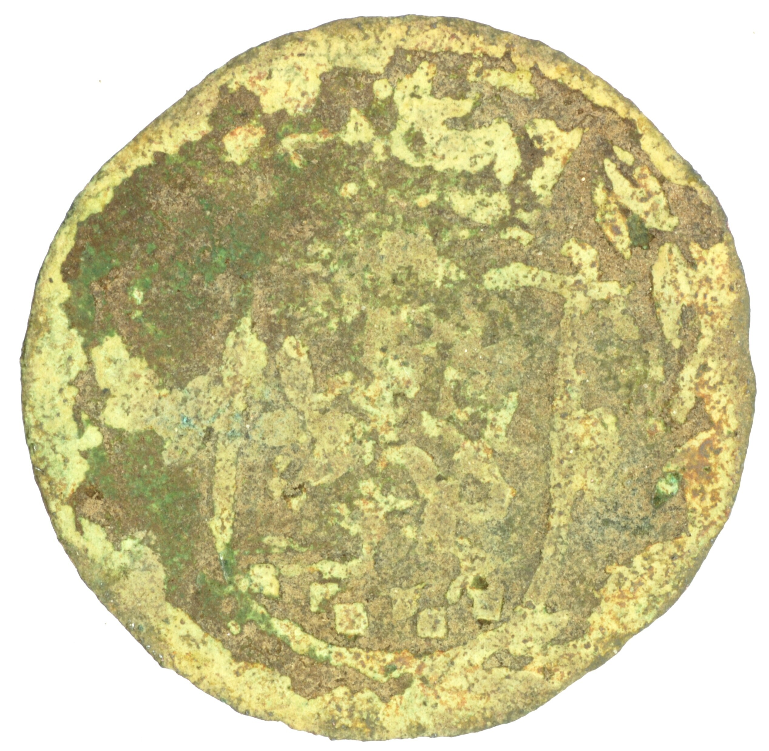 Duit; Abdij Thorn; Anna van der Marck (1604-1631); vz.: gekroond wapenschild van Mark binnen bladerkrans, binnen een parelcirkel in vier regels: •IN• / [T]HORE / •CVS• / •; muntplaats: Thorn; gewicht: 1.23 gram; zeer zeldzaam; referentie: Purmer / Wiel 9602
