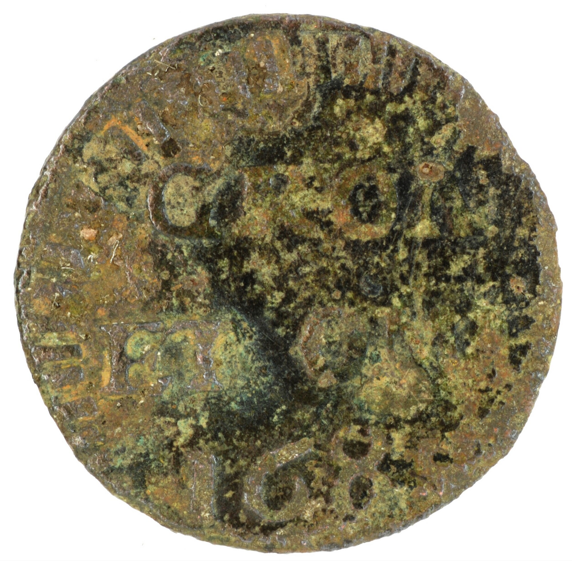 Duit; Groningen en Ommeland provincie (1581-1795); vz.: in drie regels: GRON / ET•OM[L] / 1685;kz.: met open kroon gekroond wapenschild van Groningen en Ommelanden; muntplaats: Groningen; gewicht: 1.76 gram; referentie: Purmer / Wiel 8003, CNM 2.20.24