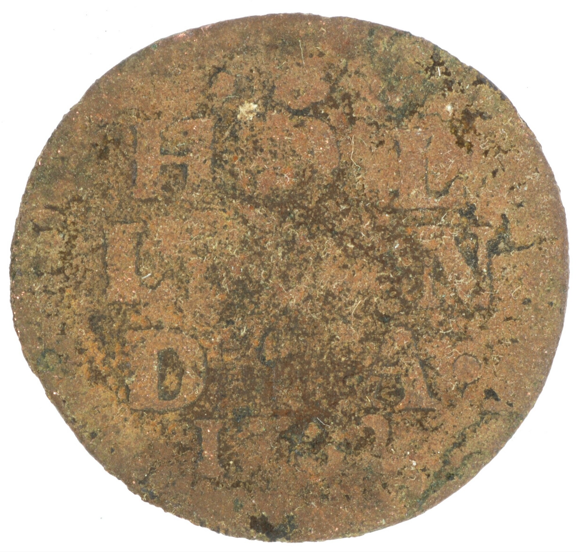 Duit; Holland Provincie (1581-1795); vz.: in vijf regels: • (rozet) [•] / HOL / L[A]N / DIA• / 1702; kz.: klimmende leeuw naar links met vrijheidshoed en een lans binnen de Hollandse tuin; muntplaats: Dordrecht; gewicht: 2.58 gram; referentie: Purmer / Wiel 2007, CNM 2.28.126
