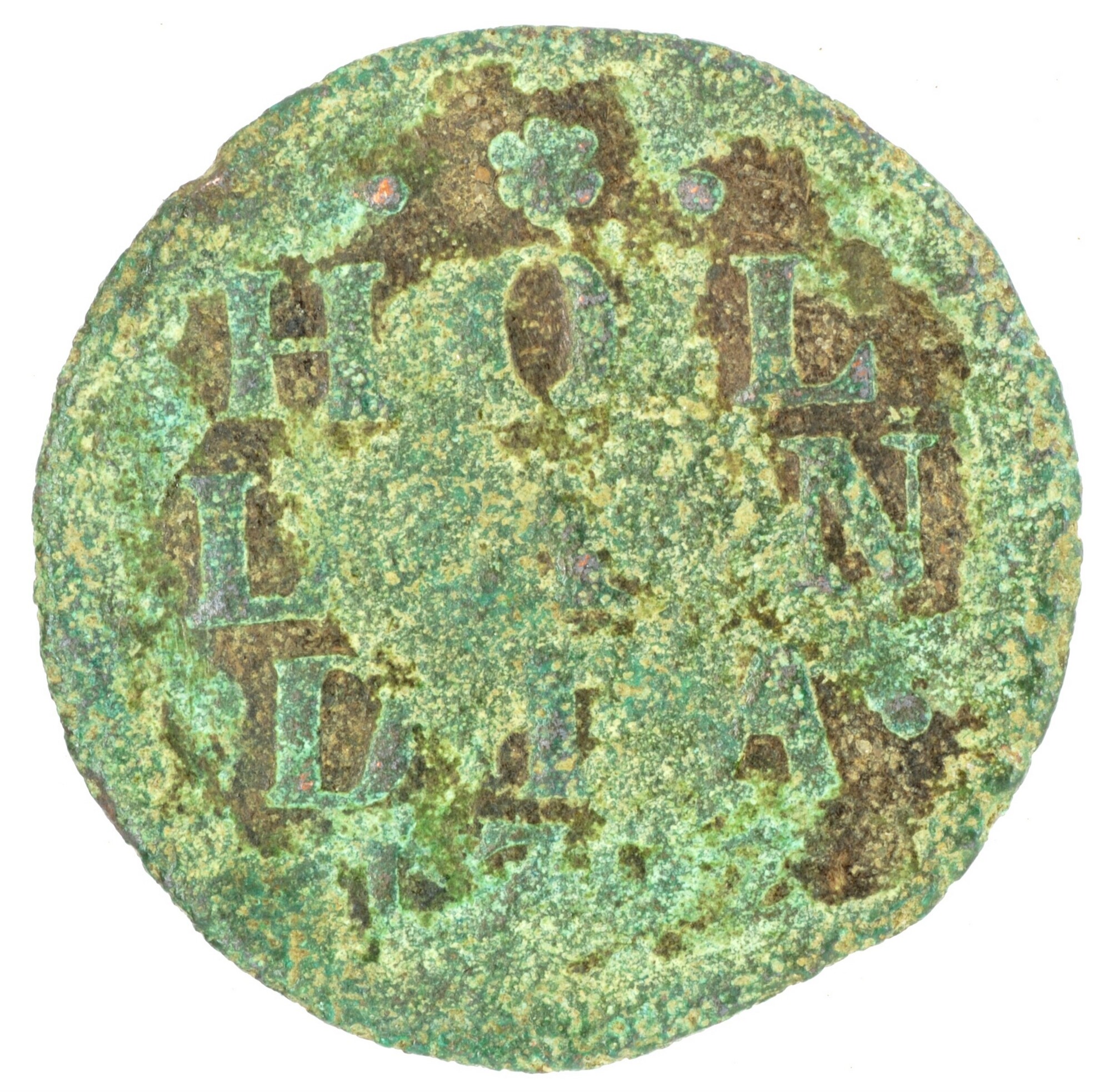Duit; Holland Provincie (1581-1795); vz.: in vijf regels: • (rozet) • / HOL / LAN / DIA• / 17[..]; kz.: klimmende leeuw naar links met vrijheidshoed en een lans binnen de Hollandse tuin; gewicht: 2.88 gram; muntplaats: Dordrecht; referentie: Purmer / Wiel 2007, CNM 2.28.126