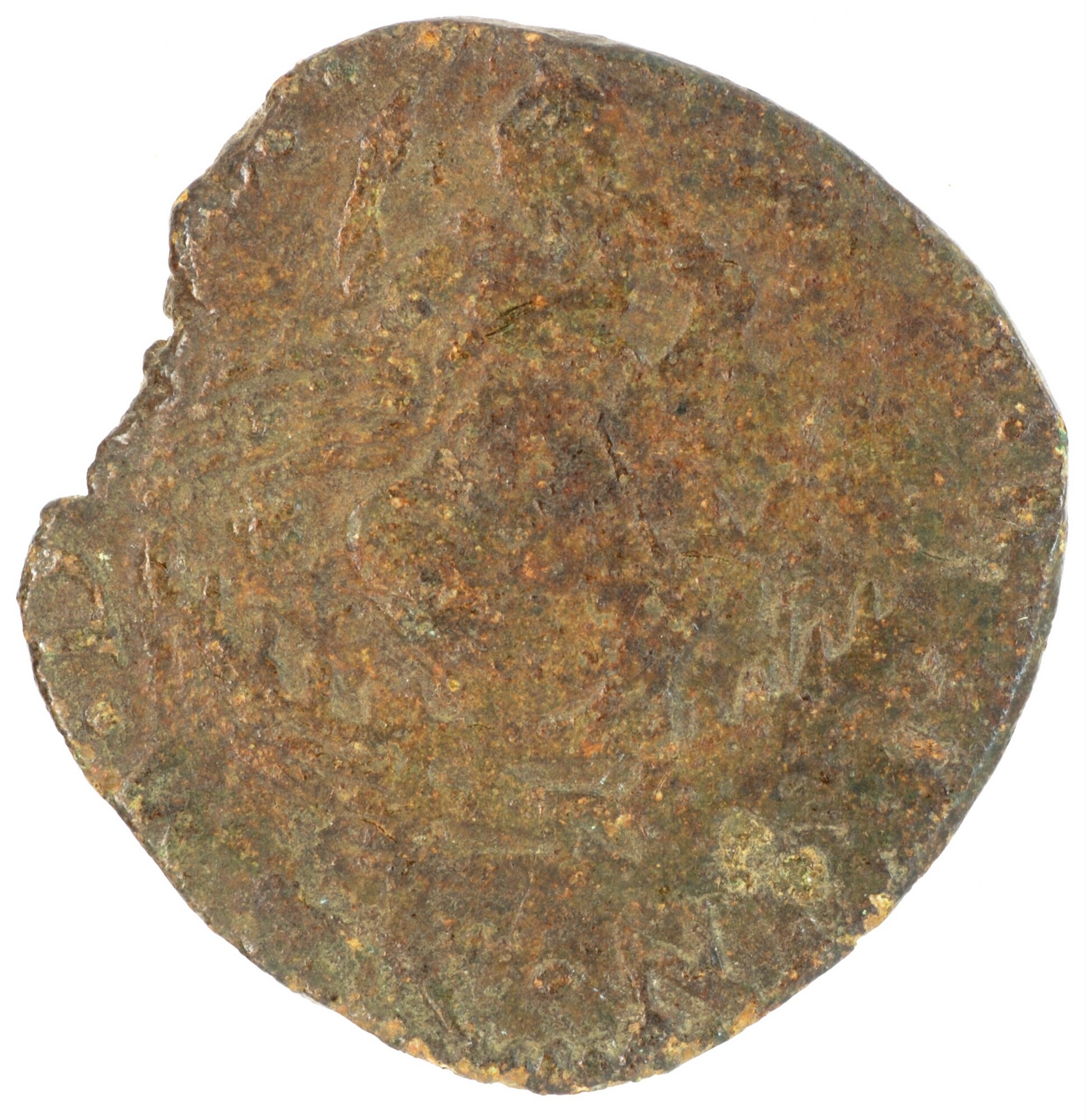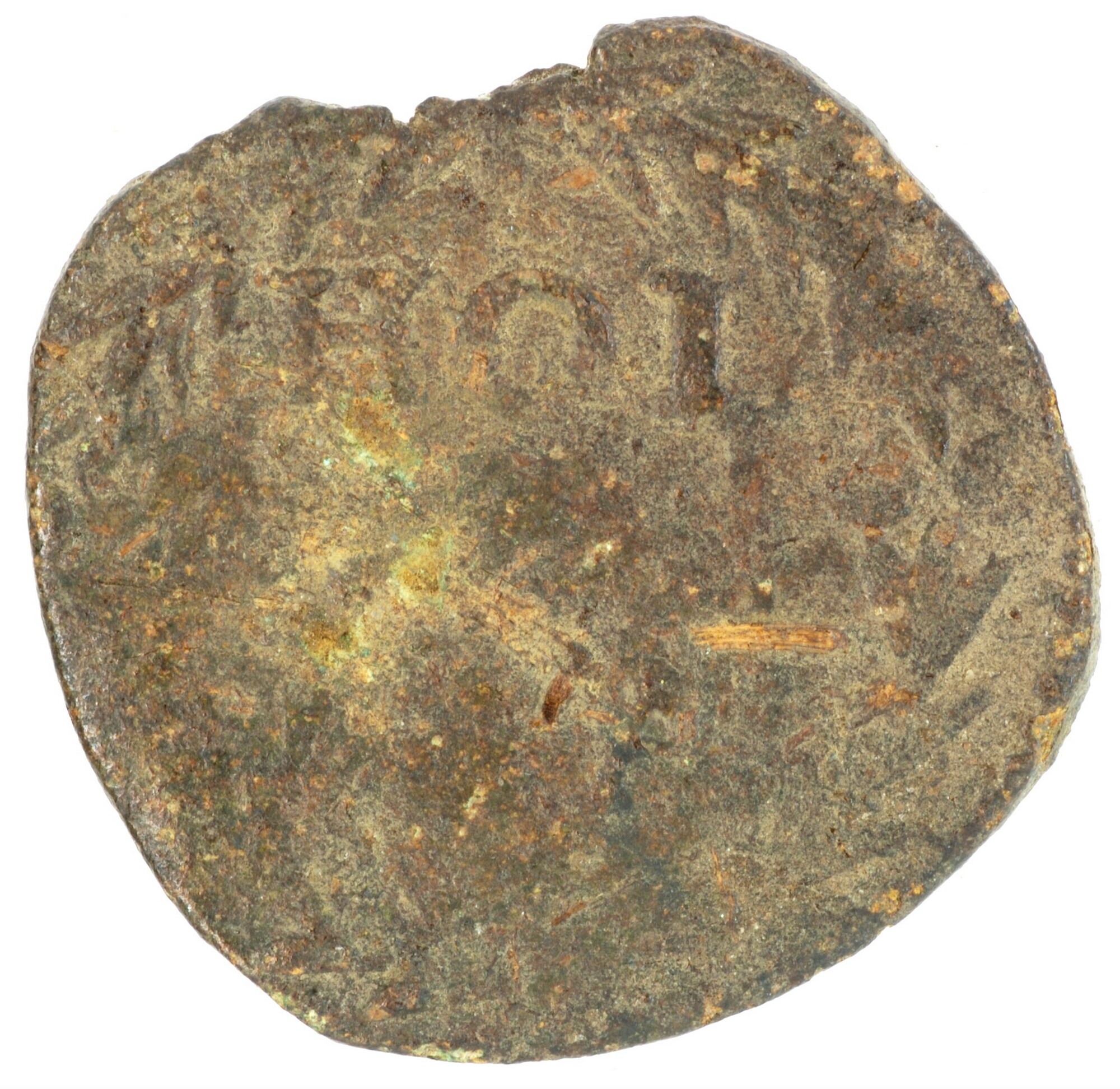Duit; Holland Provincie (1581-1795); vz.: binnen een bladerkans in drie regels: HOL / [LAN / DI]A; kz.: maagd gezeten binnen een niet gesloten omheining, met de rechterarm omhoog, wijzend naar de zon, met omschrift [•AVX]•N[OS•]IN•[NO]M•D[OM•(rozet)]•; muntplaats: Dordrecht; gewicht: 3.20 gram; referentie: Purmer / Wiel 2004, CNM 2.28.123