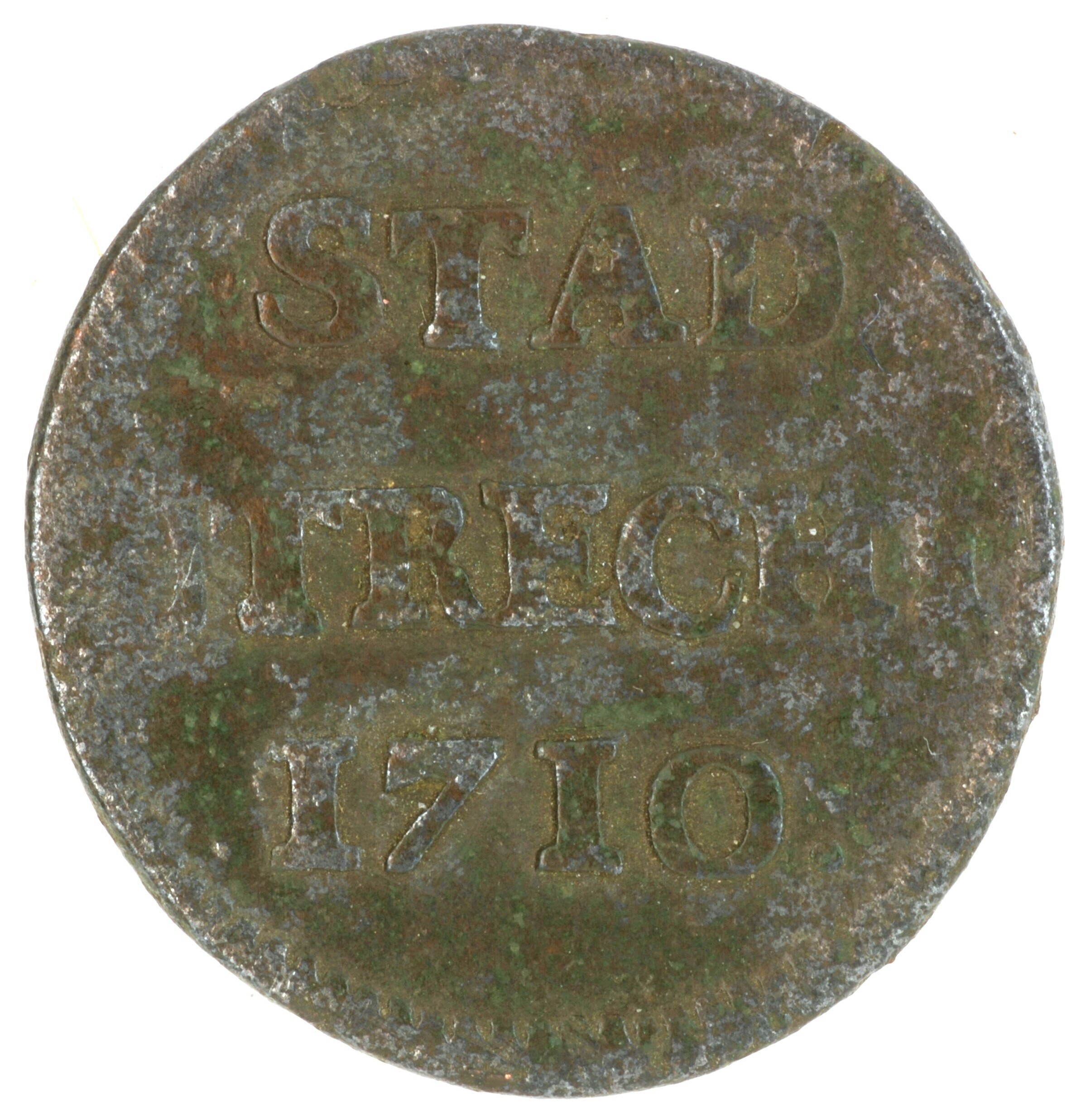 Duit; Utrecht Stad (1581-1795); vz.: in drie regels: STAD / UTRECHT / 1710.; kz.: gedamasceerd stedelijk wapenschild; muntplaats: Utrecht; gewicht: 3.38 gram; referentie: Purmer / Wiel 5110 var (punt na jaartal), CNM 2.44.20