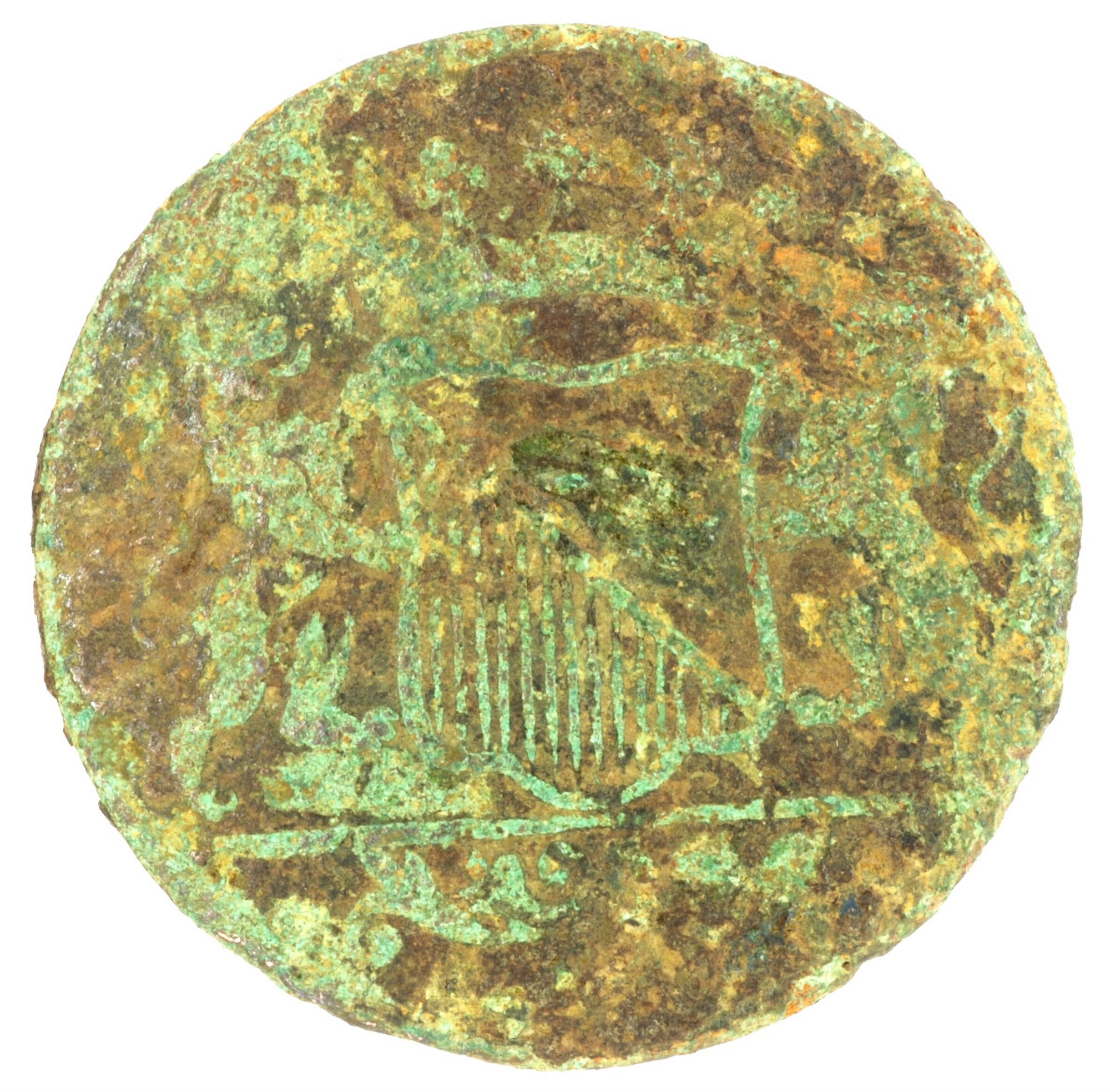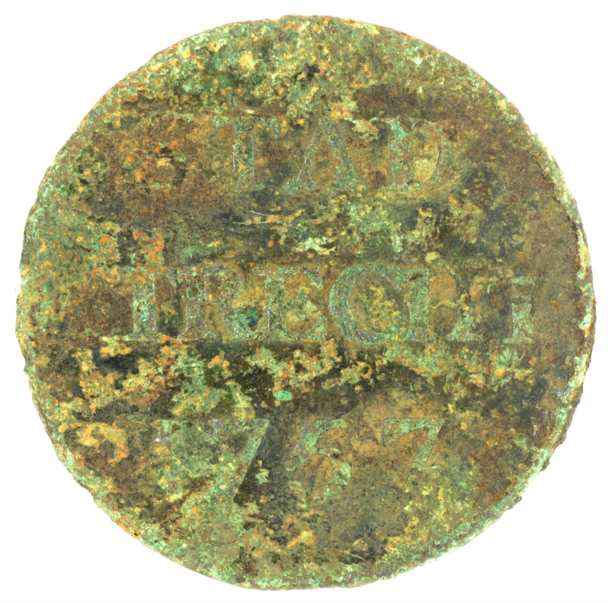Duit; Utrecht Stad (1581-1795); kz.: in drie regels: STAD / [U]TRECHT / [1]757; vz.: gedamasceerd stedelijk wapenschild grof gearceerd, gehouden door twee leeuwen, de afsnede bestaat uit een dunne lijn, met hieronder een versierde accolade met een kleine schelp; muntplaats: Utrecht; gewicht: 2.49 gram; referentie: Purmer / Wiel 5111, CNM 2.44.21
