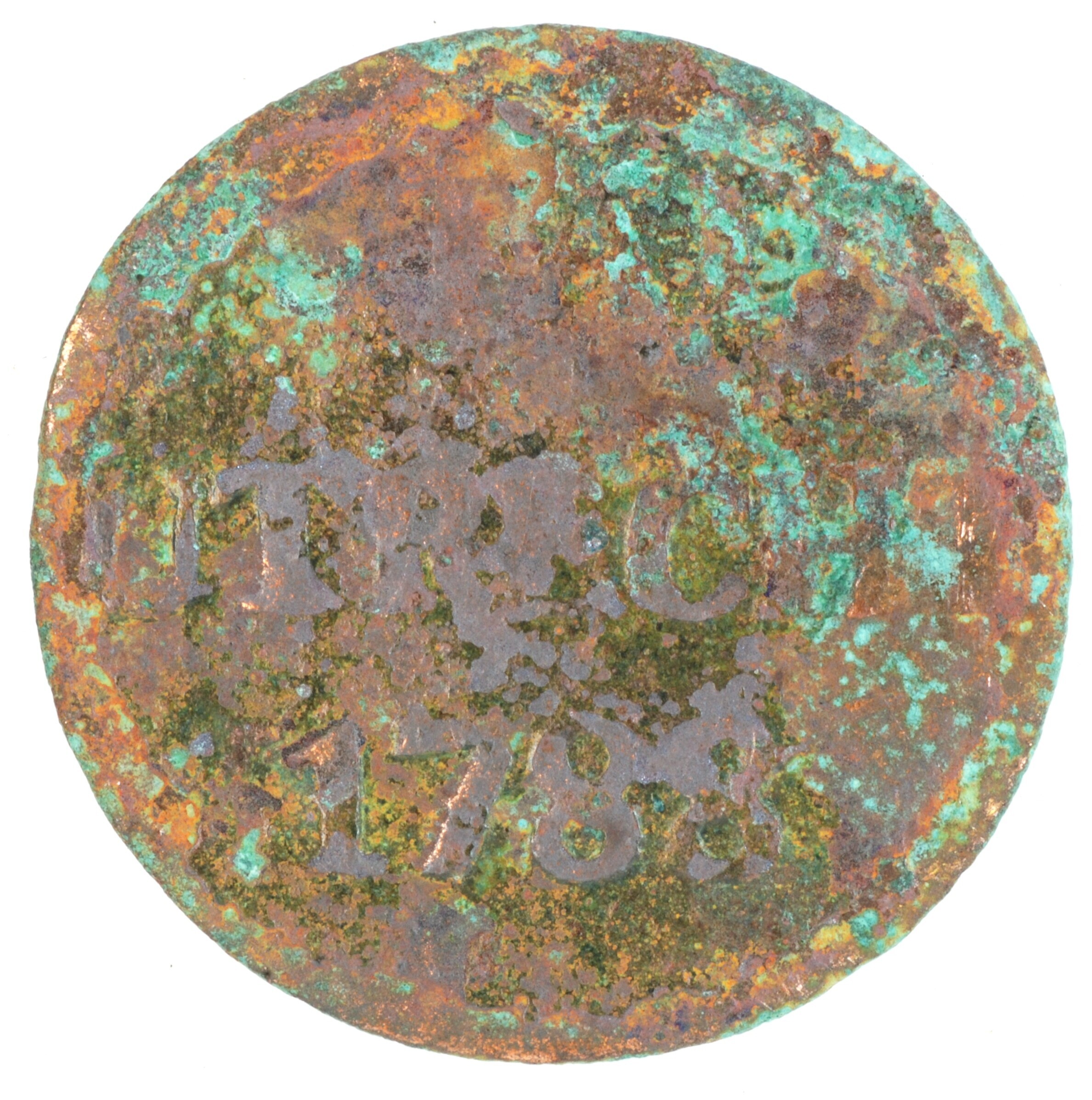 Duit; Utrecht Stad (1581-1795); vz.: in drie regels: STAD / UTRECHT / 1788; kz.: gedamasceerd stedelijk wapenschild fijn gearceerd, gehouden door twee leeuwen, de afsnede bestaat uit een dubbele lijn, met hieronder een versierde accolade met een grote schelp; muntplaats: Utrecht; gewicht: 2.75 gram; referentie: Purmer / Wiel 5114, CNM 2.44.22