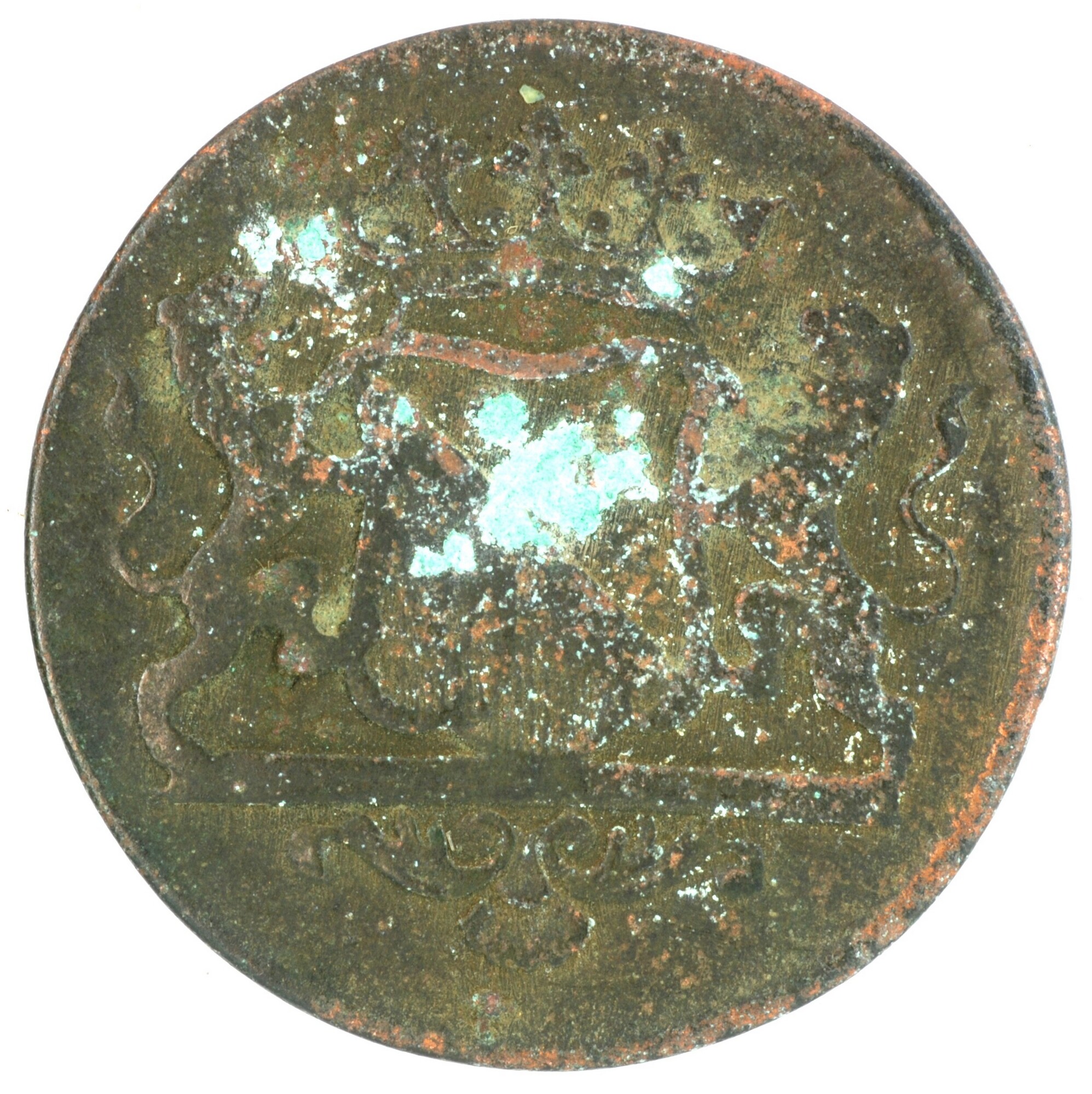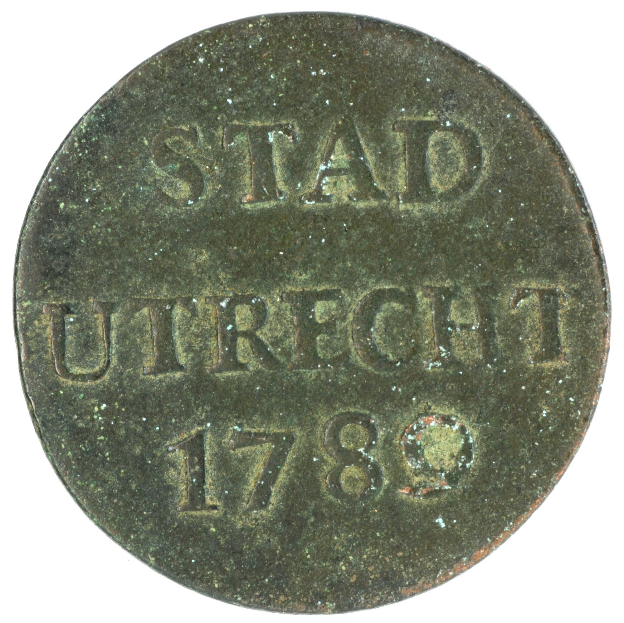 Duit; Utrecht Stad (1581-1795); vz.: in drie regels: STAD / UTRECHT / 1789; kz.: gedamasceerd stedelijk wapenschild fijn gearceerd, gehouden door twee leeuwen, de afsnede bestaat uit een dubbele lijn, met hieronder een versierde accolade met een grote schelp; muntplaats: Utrecht; gewicht: 3.25 gram; referentie: Purmer / Wiel 5114, CNM 2.44.22