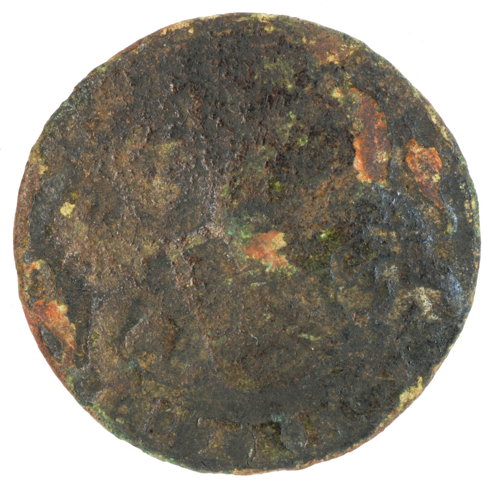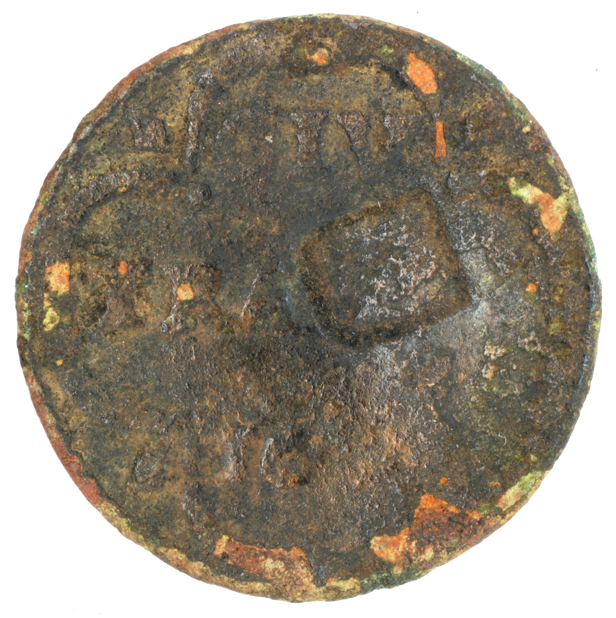 Duit; Utrecht Stad (1581-1795); vz.: binnen en aan de buitenkant met vier ruiten versierde vierpas in drie regels: CIV. / TRA[IECT.] / 16[..]; kz.: gekroond en gepointilleerd of horizontaal of vertical gearceerd stedelijk wapenschild, gehouden door twee leeuwen, met omschrift UTREC[H]T; met Utrechtse klop; muntplaats: Utrecht; gewicht: 2.12 gram; referentie: Purmer / Wiel 5107, 5108 ...