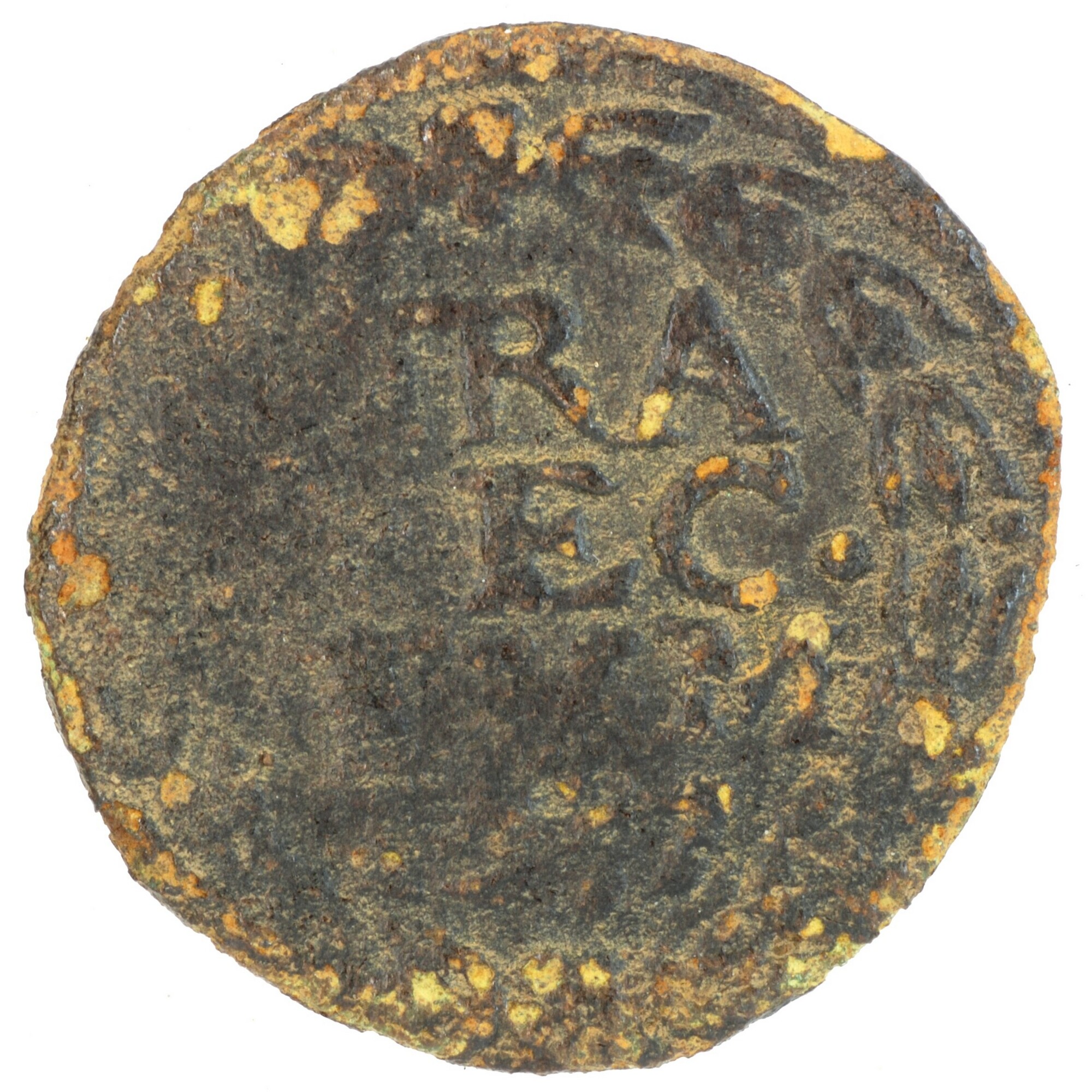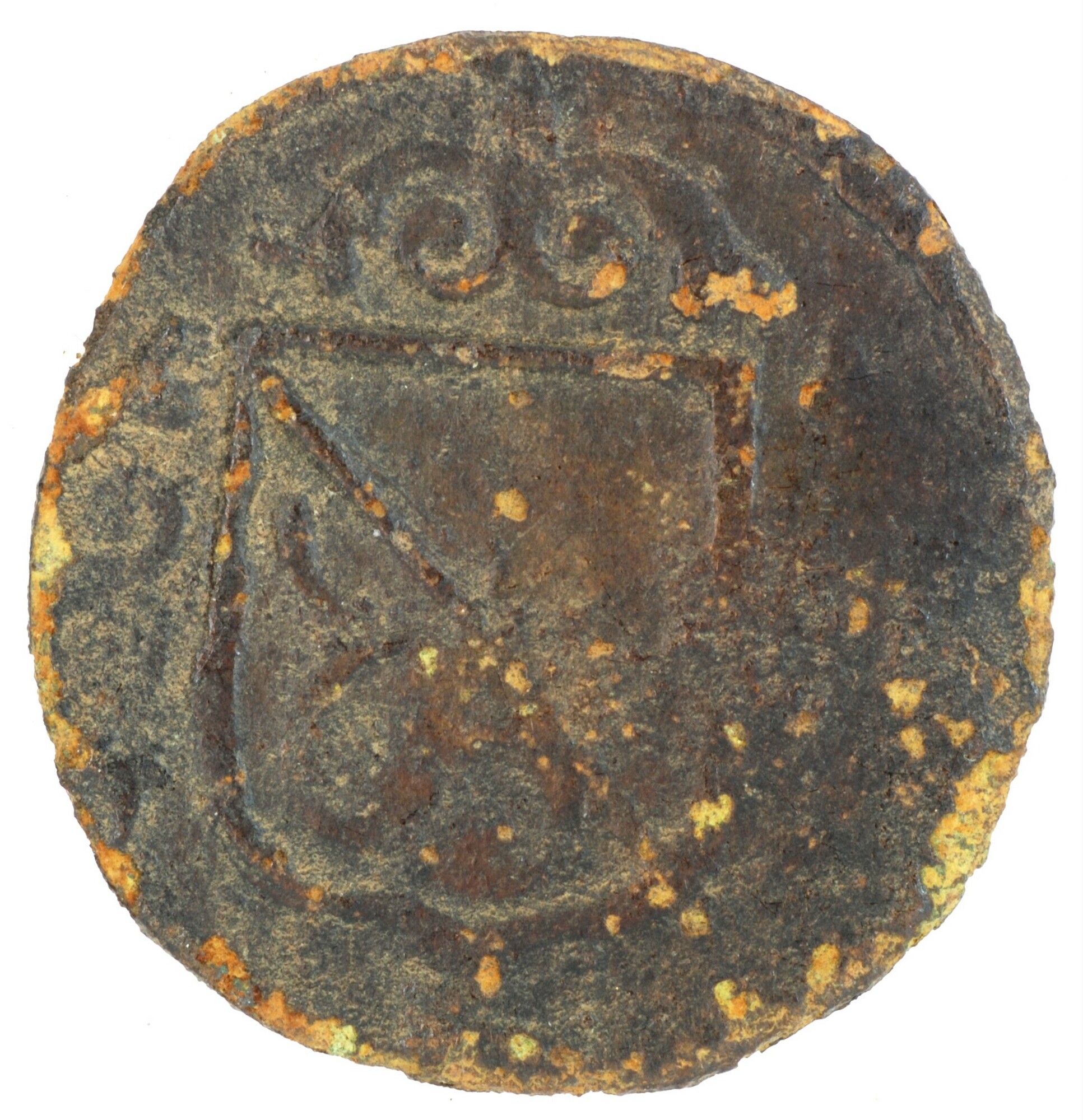 Duit; Utrecht Stad (1581-1795); vz.: binnen een bladerkrans in vier regels: TRA / [I]EC / TVM / 1637; kz.: gedamasceerd stedelijk wapenschild met rondom versiering; muntplaats: Utrecht; gewicht: 2.29 gram; referentie: Purmer / Wiel 5103, CNM 2.44.10