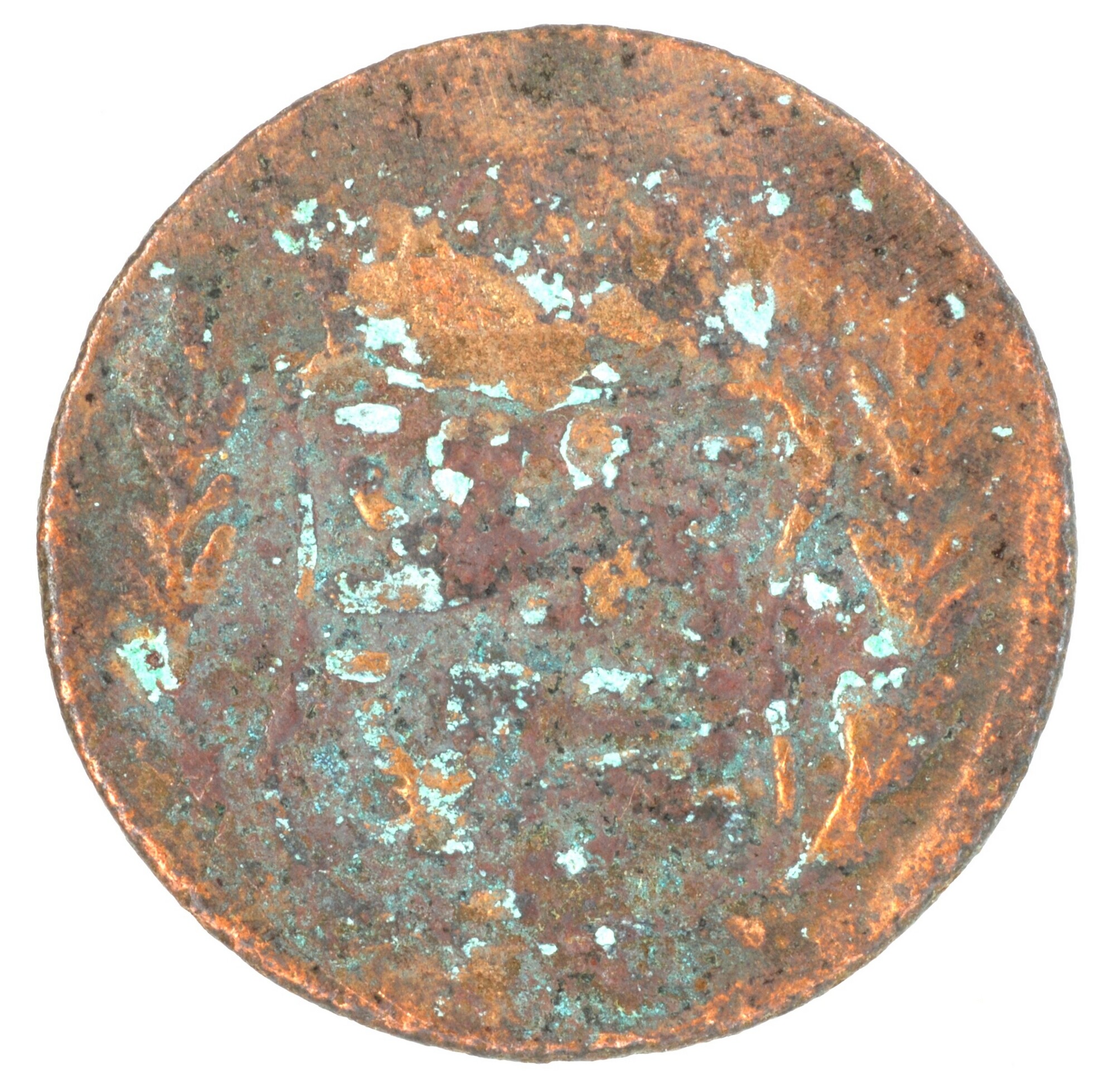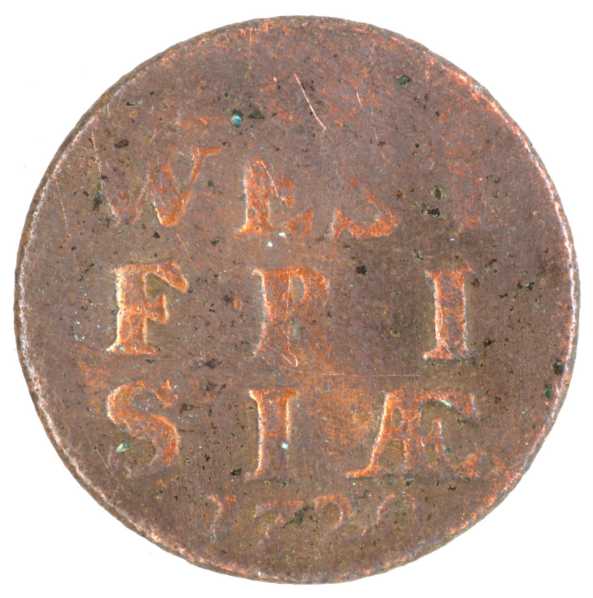 Duit; West-Friesland Provincie (1581-1795); vz.: in vijf regels: [rozet (knol) rozet] / WEST / FRI / SIAE / 1720; kz.: gekroond wapenschild van West-Friesland met lauwertakken, de kroon met ronde fleurons; muntplaats: Medemblik; gewicht: 2.91 gram; referentie: Purmer / Wiel 3008, CNM 2.46.96