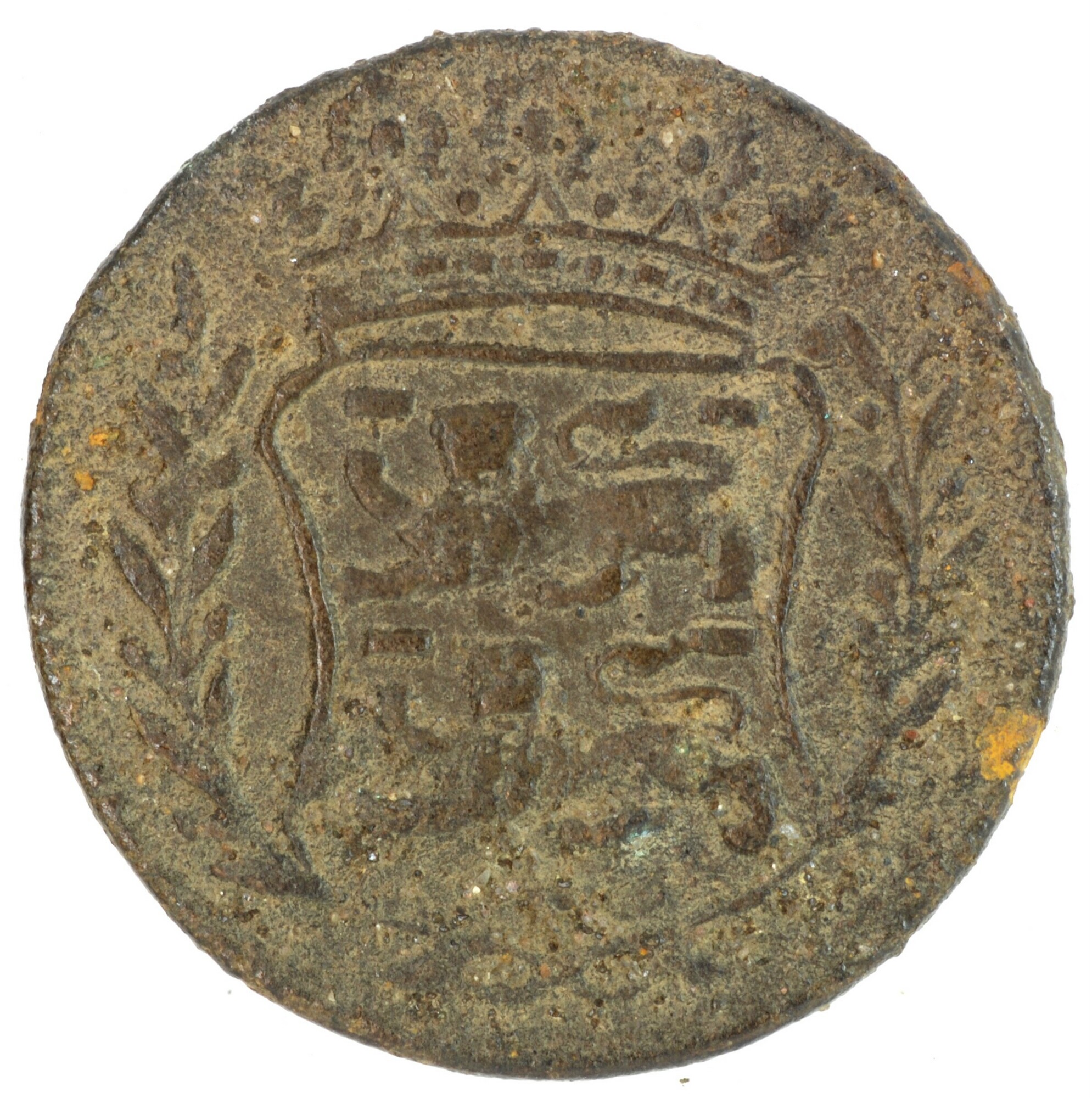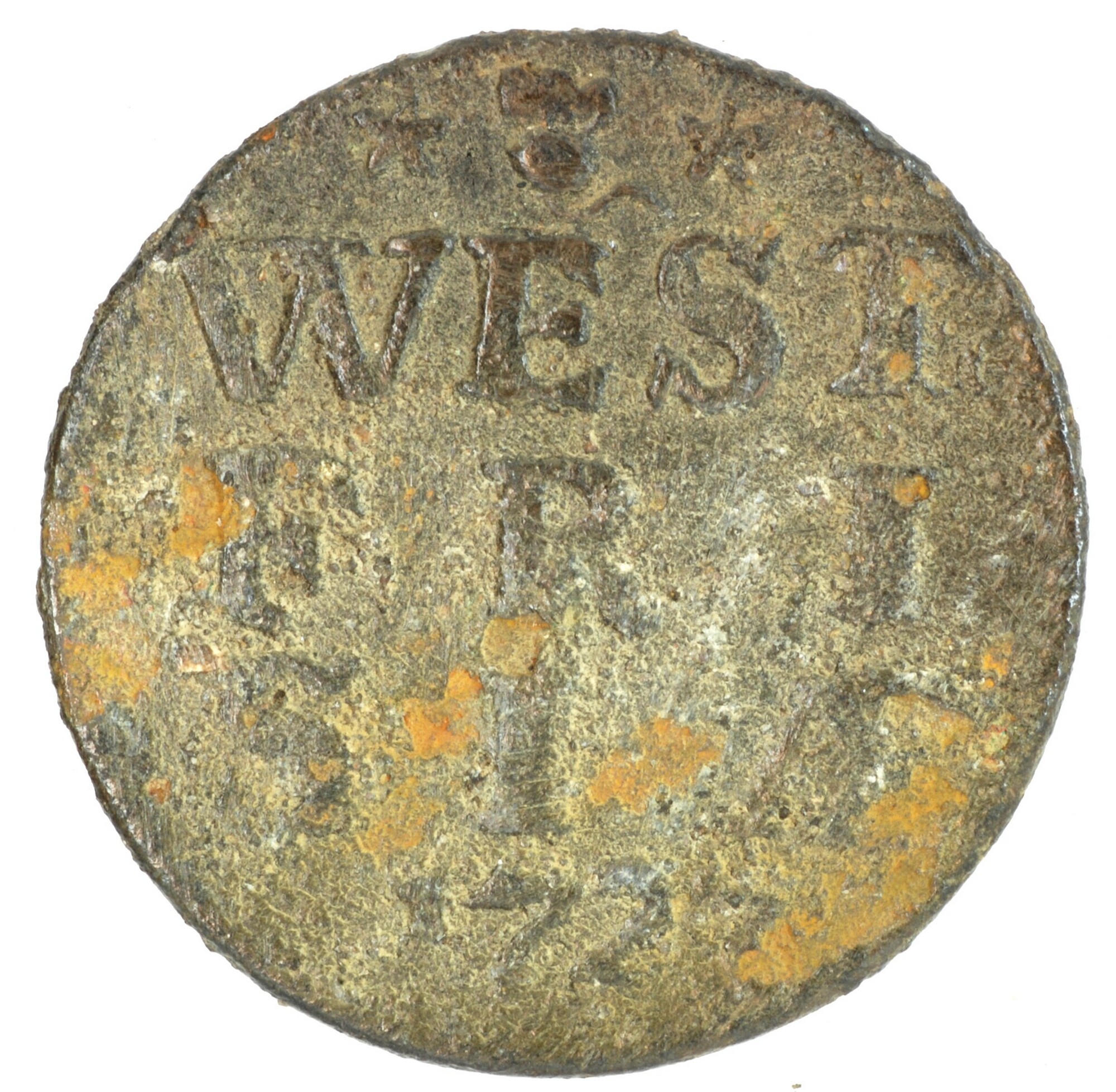 Duit; West-Friesland Provincie (1581-1795); vz.: in vijf regels: [rozet (knol) rozet] / WE[S]T / FRI / SIAE[•] / [•]1723[•]; kz.: gekroond wapenschild van West-Friesland met lauwertakken, de kroon met ronde fleurons; muntplaats: Medemblik; gewicht: 3.34 gram; referentie: Purmer / Wiel 3009, CNM 2.46.96