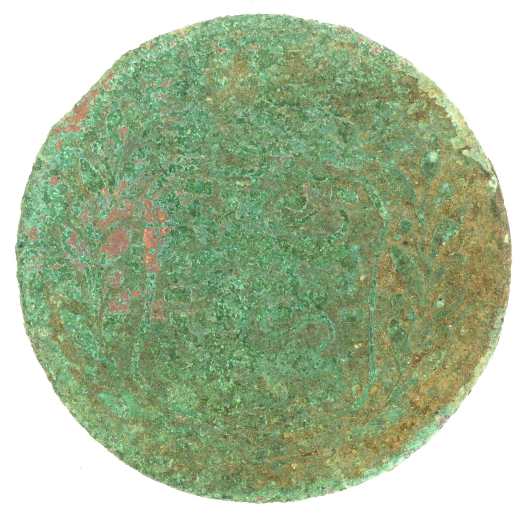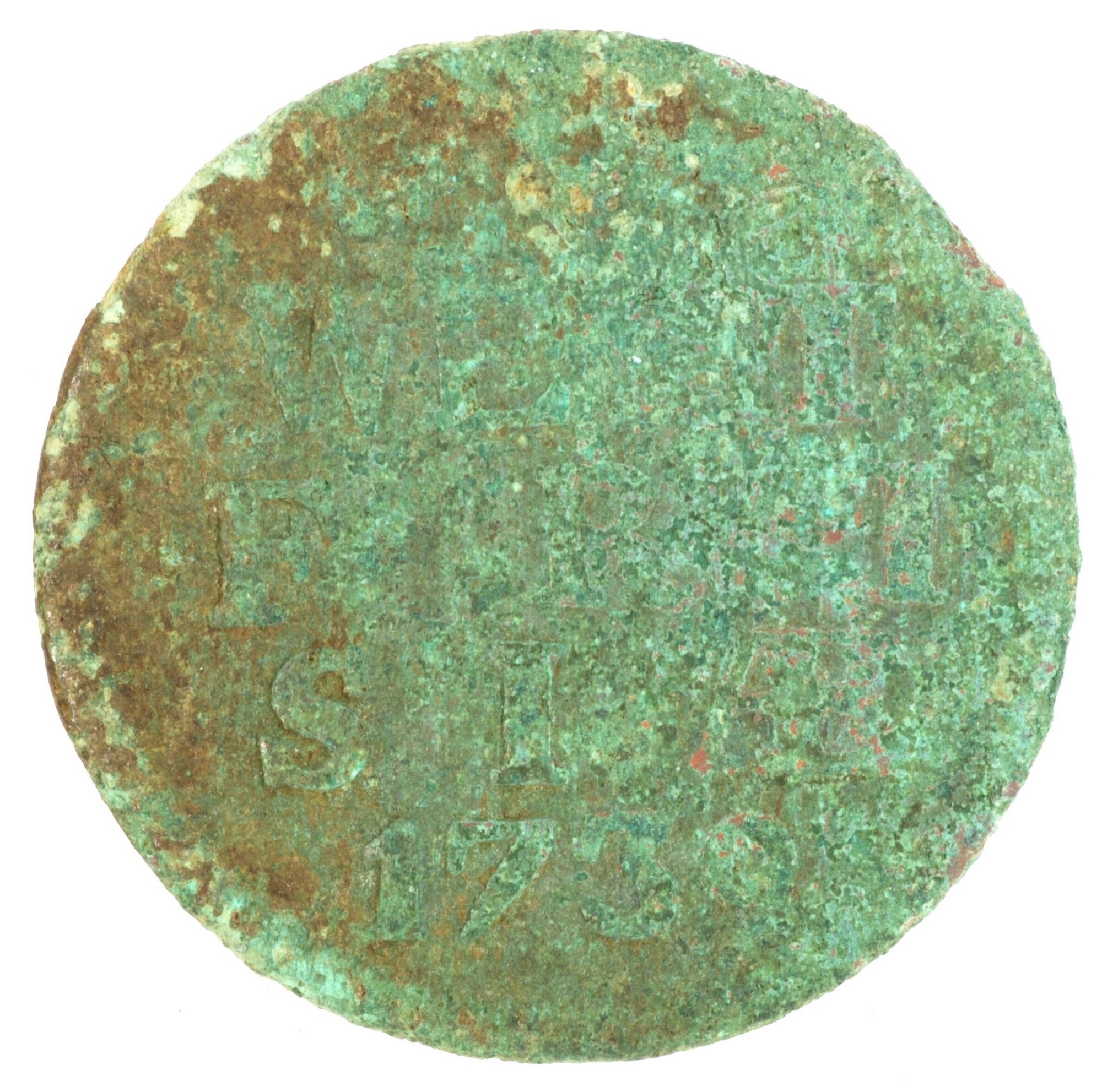 Duit; West-Friesland Provincie (1581-1795); vz.: in vijf regels: [rozet (knol) rozet] / WE[S]T / FRI / SIAE / 1739; kz.: gekroond wapenschild van West-Friesland met lauwertakken, kleine kroon met ronde fleurons; muntplaats: Enkhuizen; gewicht: 2.69 gram; referentie: Purmer / Wiel 3010, CNM 2.46.96