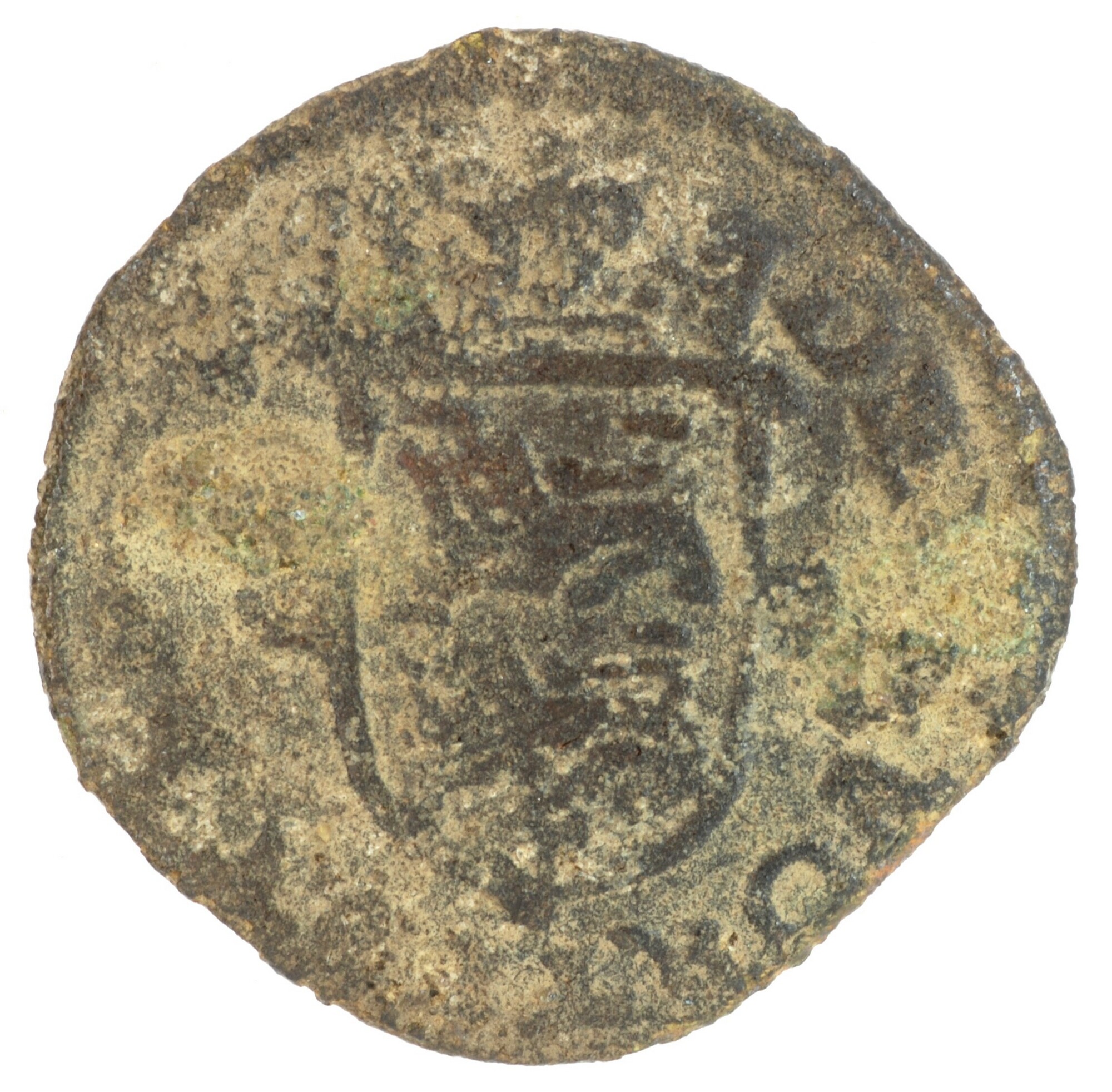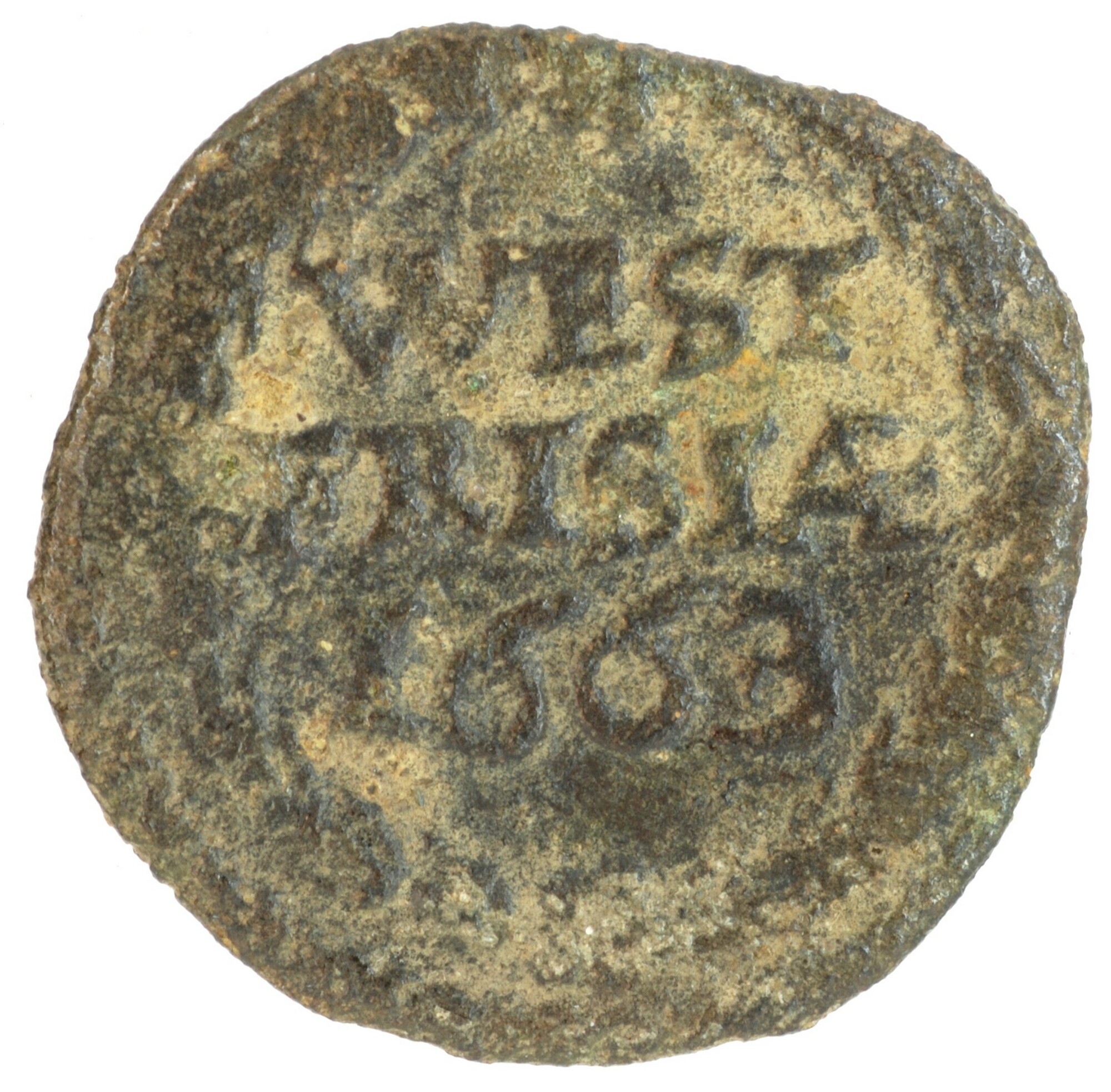 Duit; West-Friesland Provincie (1581-1795); kz.: gekroond en versierd wapenschild van West-Friesland, terzijde twee punten, met omschrift DE[VS•]FORTI•[E]T•[SP•NOS]; vz.: binnen een bladerkrans in drie regels WEST / FRISIAE / 1663; muntplaats: Hoorn; gewicht: 1.88 gram; referentie: Purmer / Wiel 3003, CNM 2.46.91