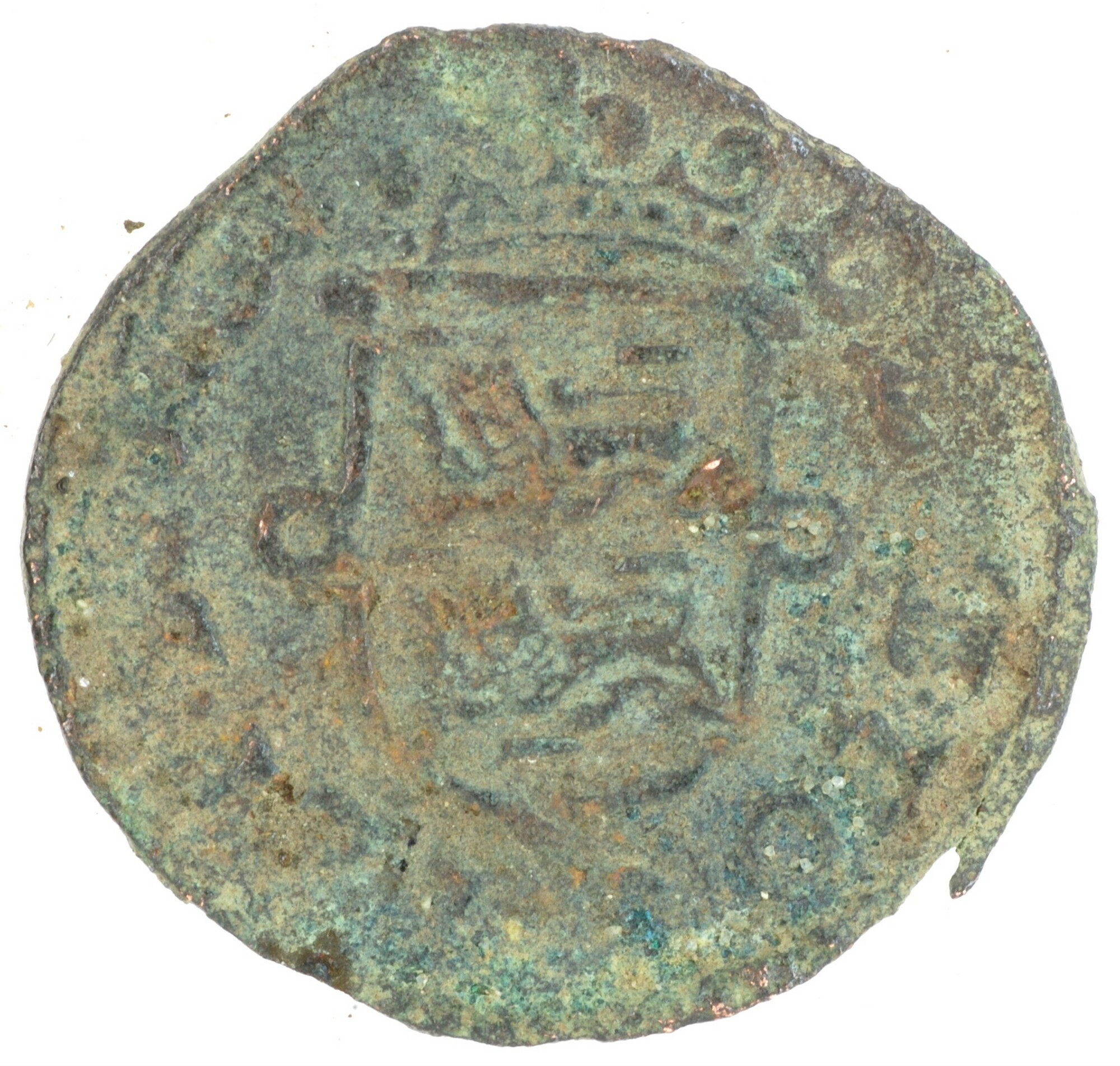 Duit; West-Friesland Provincie (1581-1795); vz.: binnen een bladerkrans in drie regels WEST / FRISIAE / 1663; kz.: gekroond en versierd wapenschild van West-Friesland, terzijde twee punten, met omschrift DEVS•FOR[T]I•ET•SP•NOS; muntplaats: Hoorn; gewicht: 1.72 gram; referentie: Purmer / Wiel 3003, CNM 2.46.91