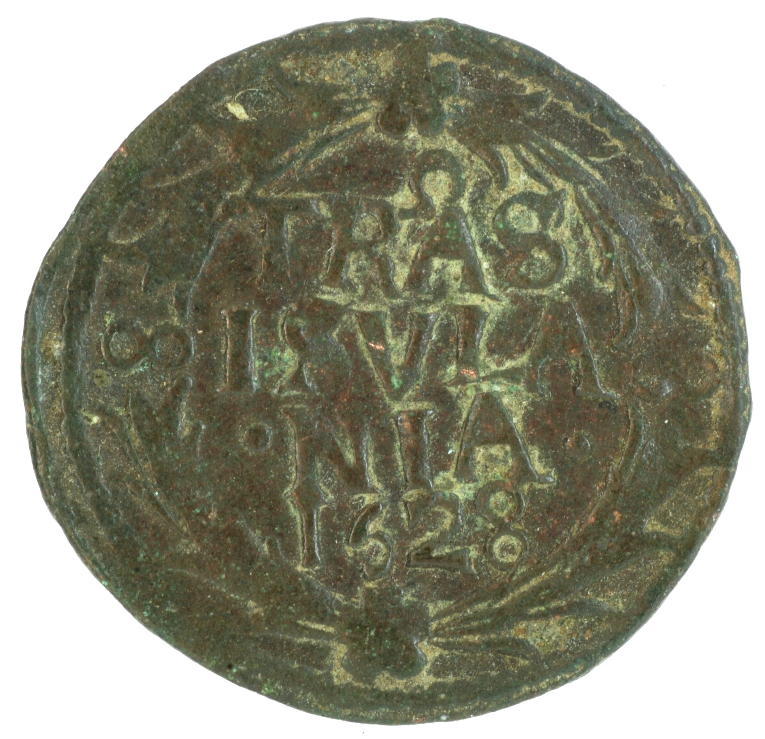 Duit; Overijssel provincie (1581-1795); vz.: binnen een bladerkrans; kz.: in vier regels: TR^AS / ISVLA / •NIA• / 1628; kz.: gekroond en versierd wapenschild van Overijssel; muntplaats: Kampen; gewicht: 2.03 gram; referentie: Purmer / Wiel 7005, CNM 2.38.111