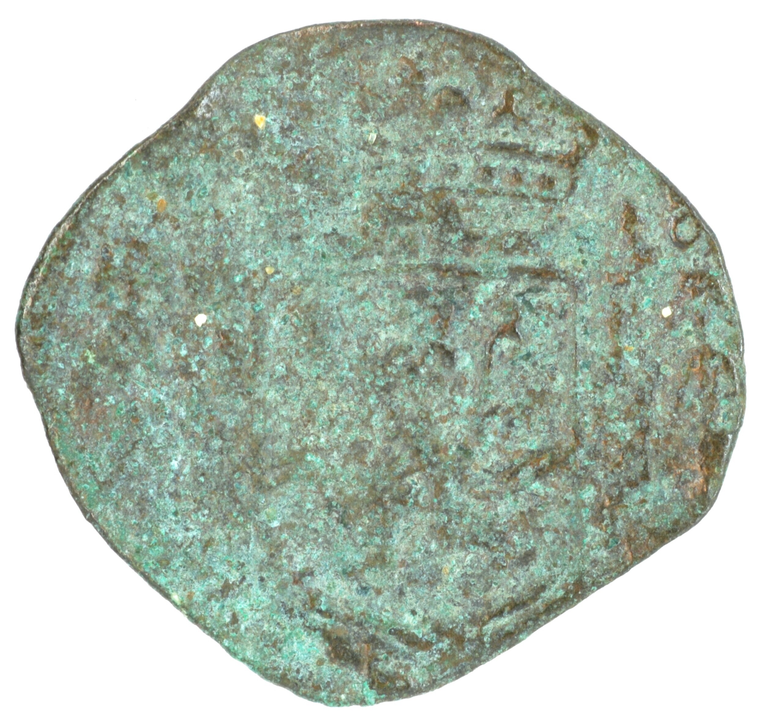Duit; Overijssel provincie (1581-1795); vz.: binnen een bladerkrans in vijf regels: • • • / TRAN / ISVL[A / [•N]I[A•] / • ; kz.: gekroond en versierd wapenschild van Overijssel; muntplaats: Kampen; gewicht: 1.65 gram; referentie: Purmer / Wiel 7004 var (de drie punten in de eerste regel in een driehoek), CNM 2.38.110