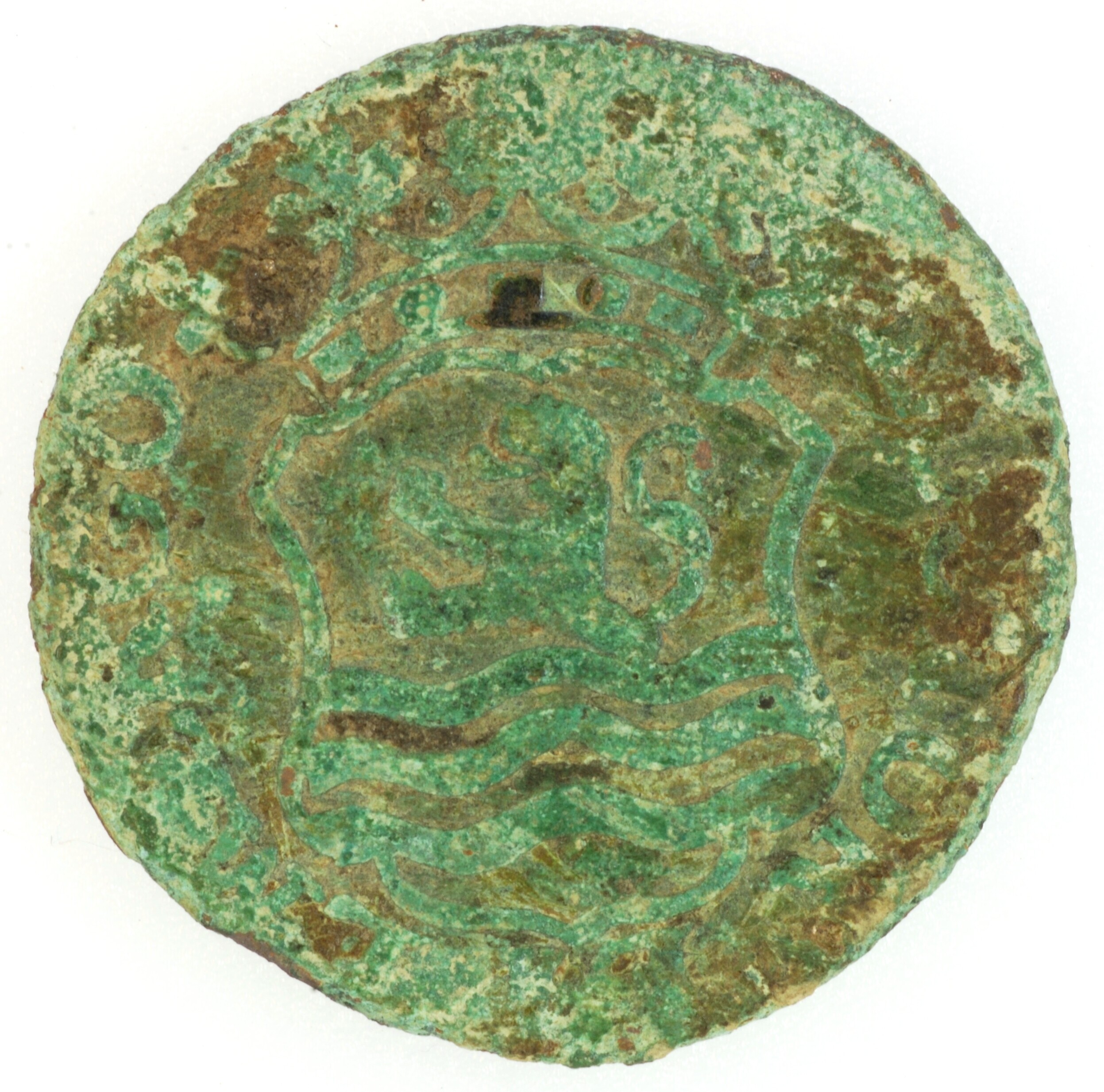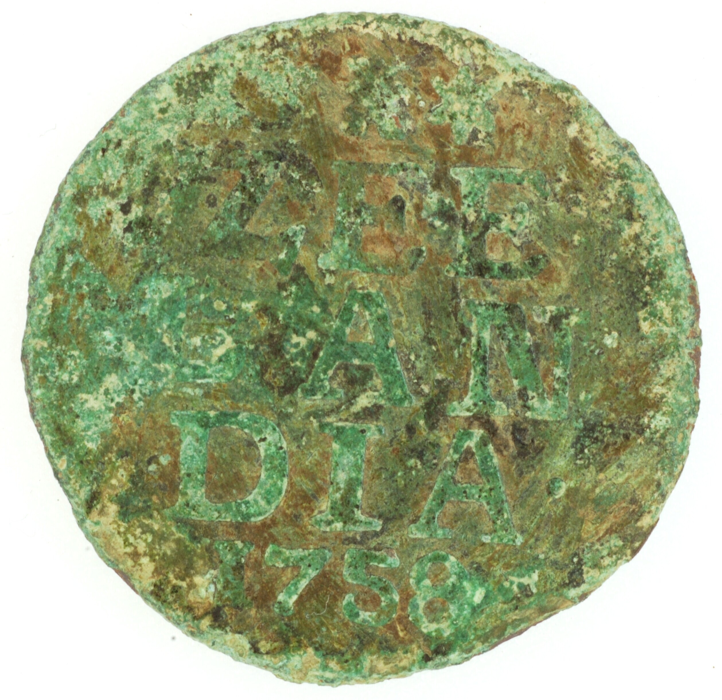 Duit; Zeeland Provincie (1581-1795); vz.: gekroond, zijdelings ingedeukt wapenschild van Zeeland, de staart van de leeuw is naar achteren gekruld, met omschrift LUCTOR [ET] EMERGO; kz.: in vijf regels: ster (burcht) ster / ZEE / LAN / DIA / 1758; muntplaats: Middelburg; gewicht: 2.36 gram; referentie: Purmer / Wiel 4011, CNM 2.49.112