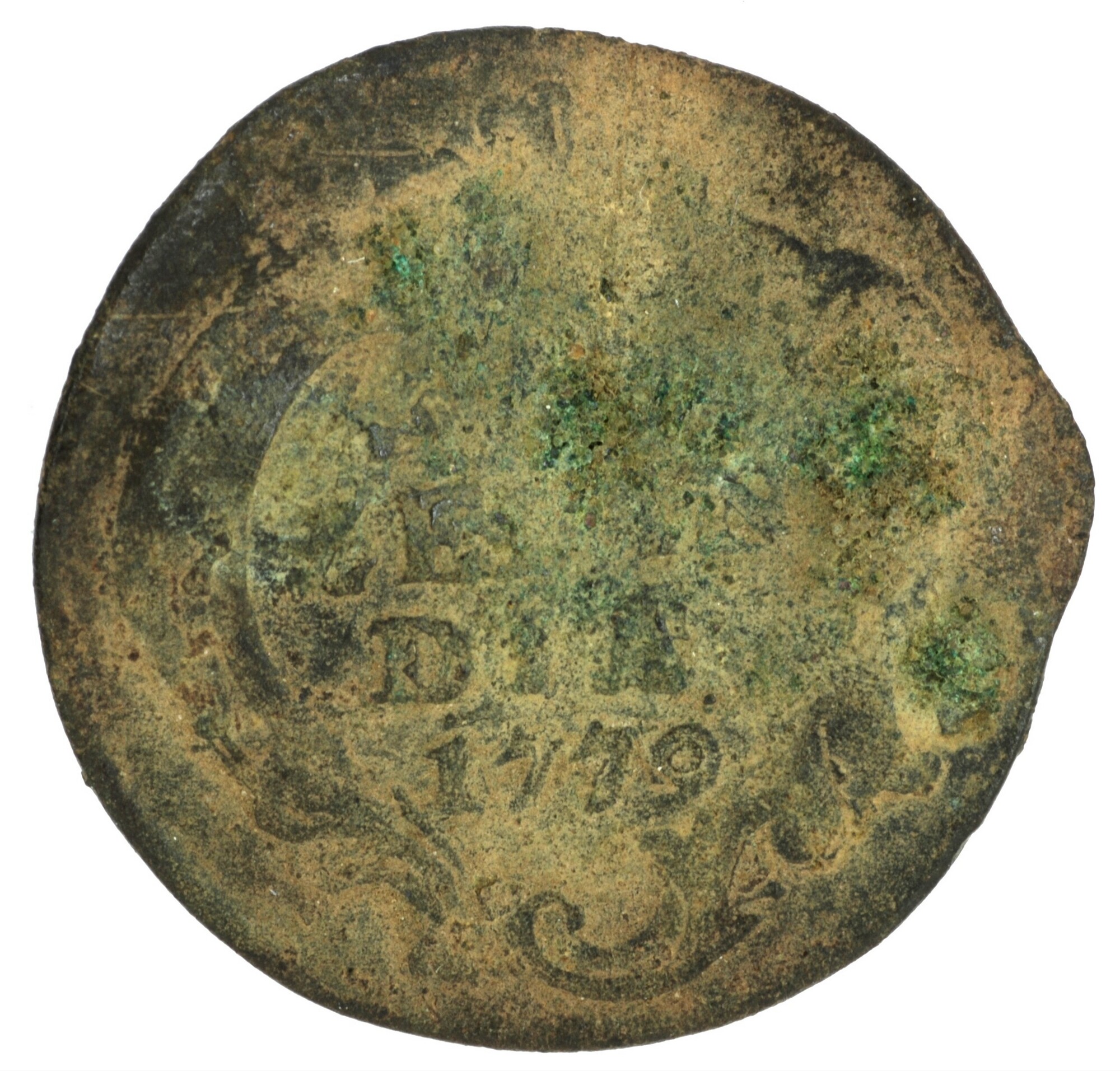 Duit; Zeeland Provincie (1581-1795); vz.: gekroond ovaal wapenschild van Zeeland in een rococo lijst, met omschrift LUCTOR ET – EMERGO; kz.: binnen een rococo versiering in vier regels: [ster (burcht) ster] / ZELAN / DIA / 1779; muntplaats: Middelburg; gewicht: 2.79 gram; referentie: Purmer / Wiel 4012, CNM 2.49.113