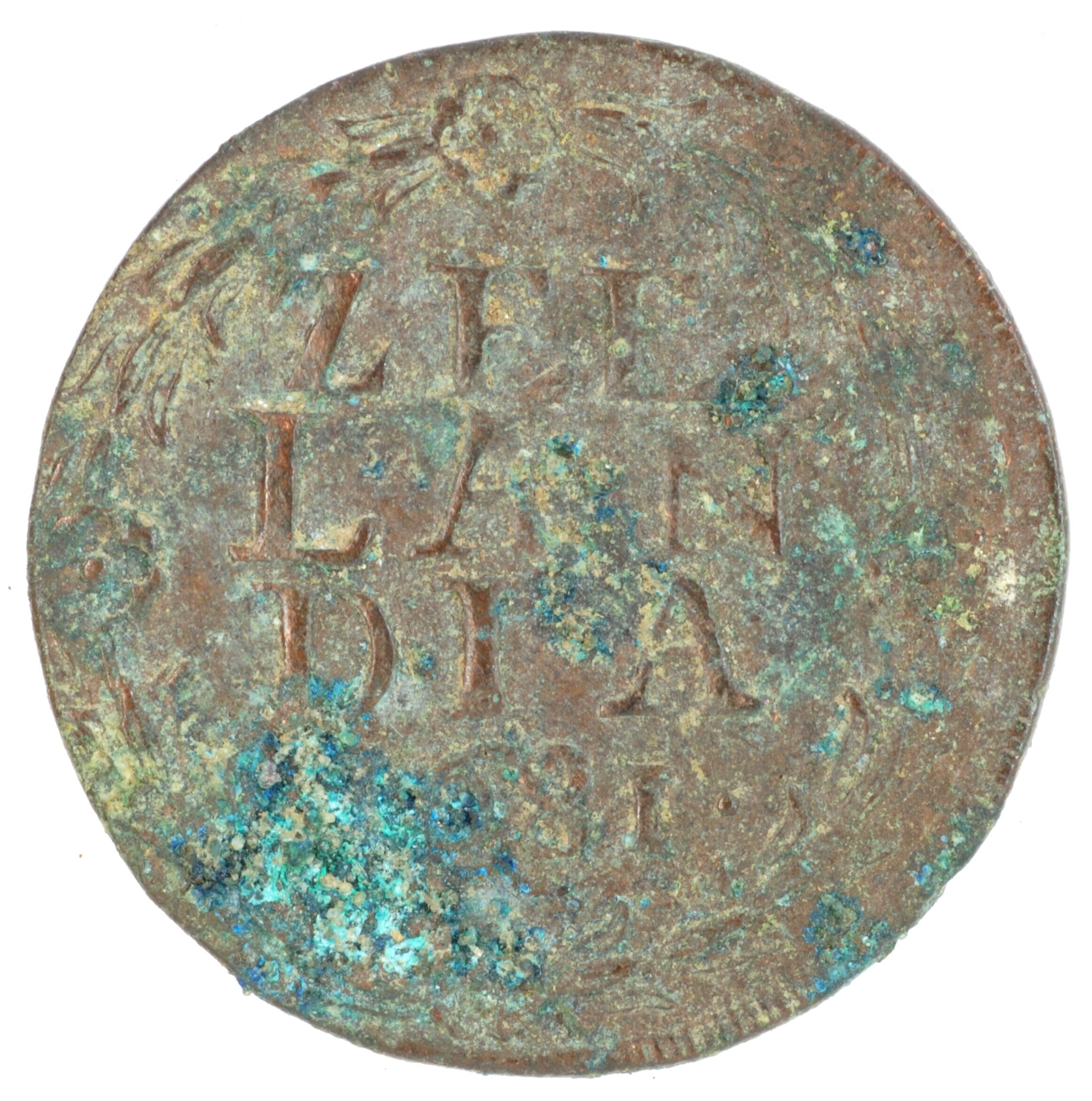Duit; Zeeland Provincie (1581-1795); vz.: de maagd, zittend achter het wapenschild van Zeeland in een tuin met gesloten omheining, met omschrift LUC[TOR•] – E[T•EM]ER[GO]• (burcht) •; kz.: binnen een bladerkrans in vier regels: ZEE / LAN / DIA / 1681•; muntplaats: Middelburg; gewicht: 1.97 gram; referentie: Purmer / Wiel 4007, CNM 2.49.108