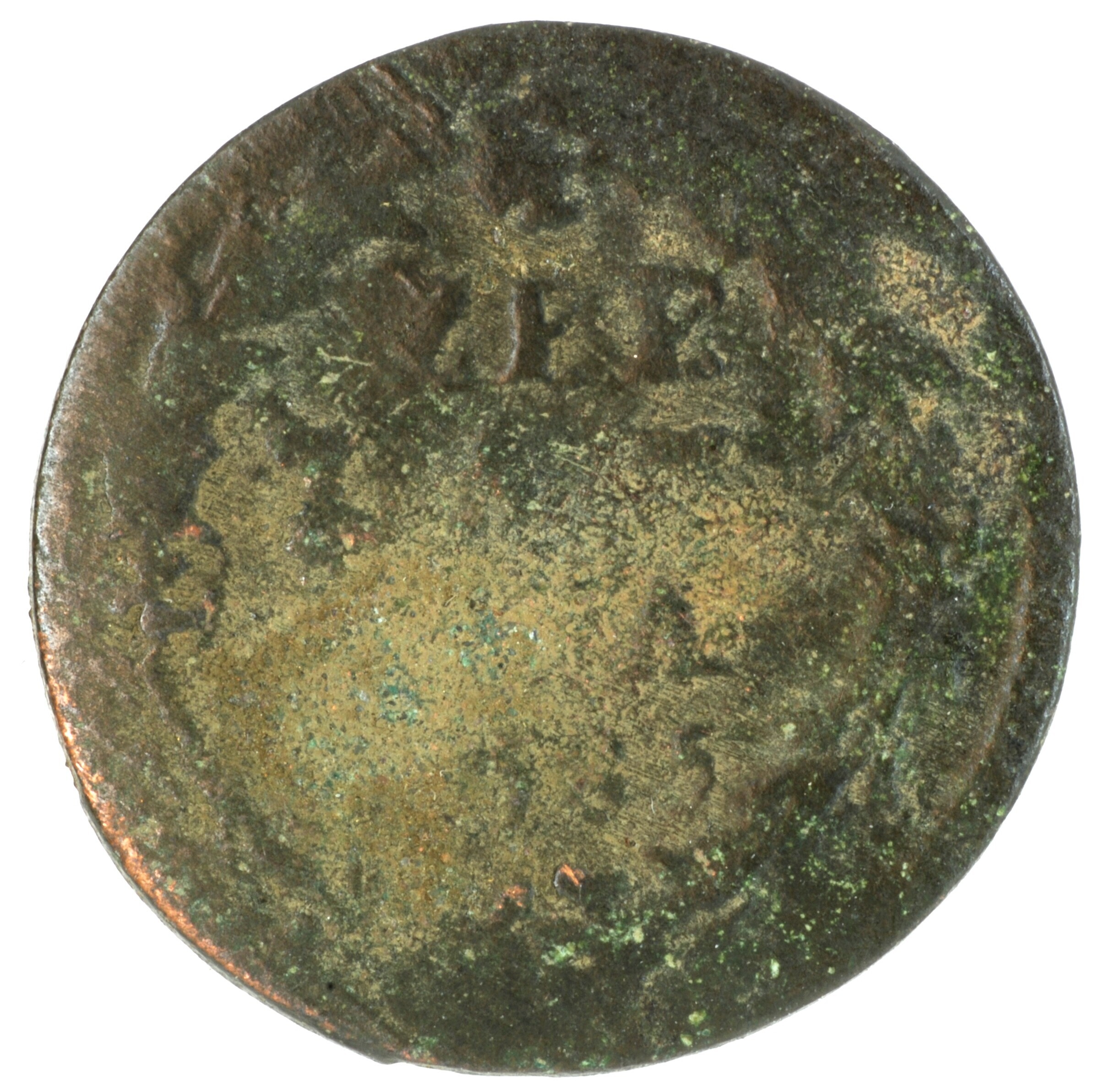 Duit; Zeeland Provincie (1581-1795); vz.: de maagd, zittend achter het wapenschild van Zeeland in een tuin met gesloten omheining, met omschrift [LUCTOR• - ET•]EMERGO (burcht); kz.: binnen een bladerkrans in vier regels: ZEE / LA[N / DI]A / [16]85; muntplaats: Middelburg; gewicht: 2.49 gram; referentie: Purmer / Wiel 4007 var (geen punt voor- en na ...