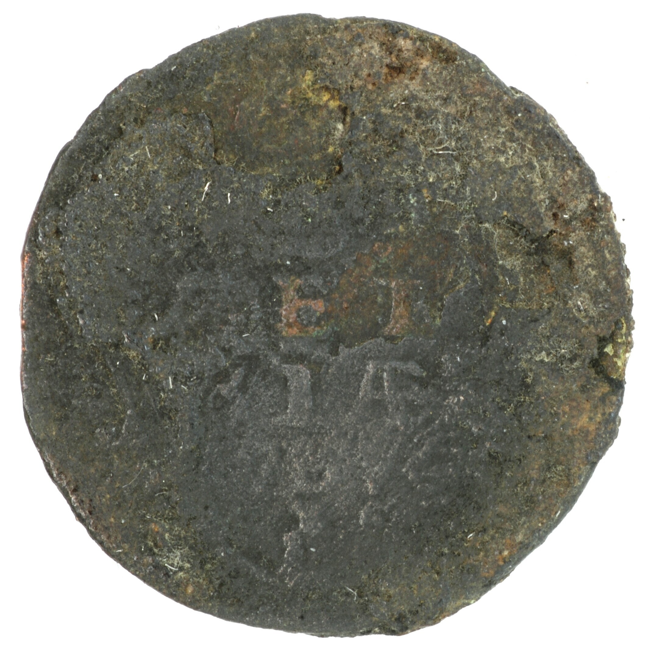 Duit; Gelderland Provincie (1581-1795); kz.: gekroond wapenschild van Gelderland, met omschrift [IN] DEO [EST SPES NOSTRA]; vz.: in vijf regels: [•]D• / [G]EL / RIAE / 176[.] / (geknotte boom met loot); muntplaats: Harderwijk; gewicht: 2.31 gram; referentie: Purmer / Wiel 1017, CNM 2.17.195