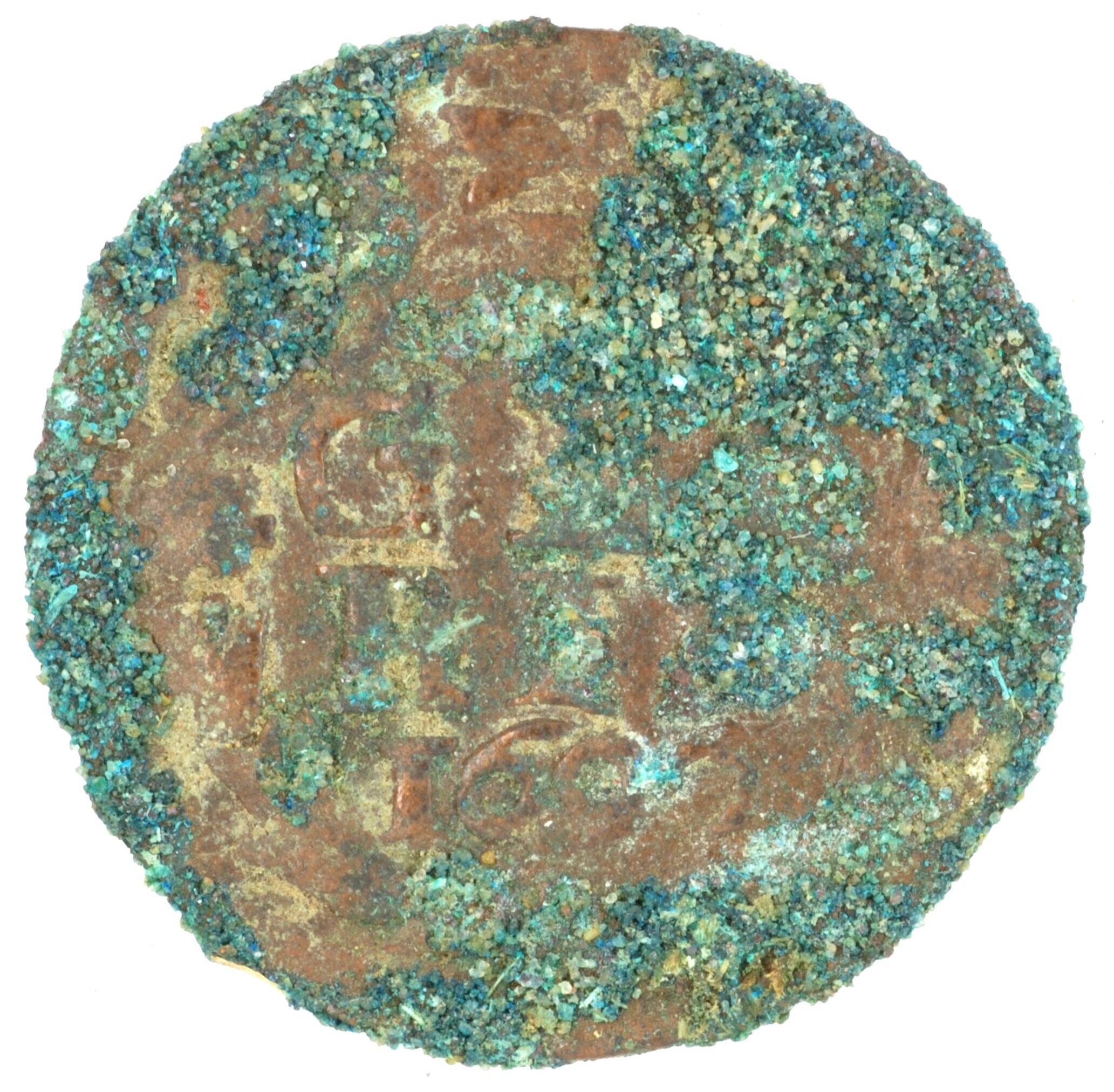 Duit; Gelderland Provincie (1581-1795); vz.: binnen een bladerkrans in vier regels:[•D•] / G[EL] / RI[AE] / 1690; kz.: gekroond wapenschild van Gelderland met lintvormige versiering, met omschrift IN DEO – [SP NOST]; muntplaats: Harderwijk; gewicht: 1.87 gram; referentie: Purmer / Wiel 1010, CNM 2.17.187 (in Purmer / Wiel staat dit type weergegeven met punten tussen ...